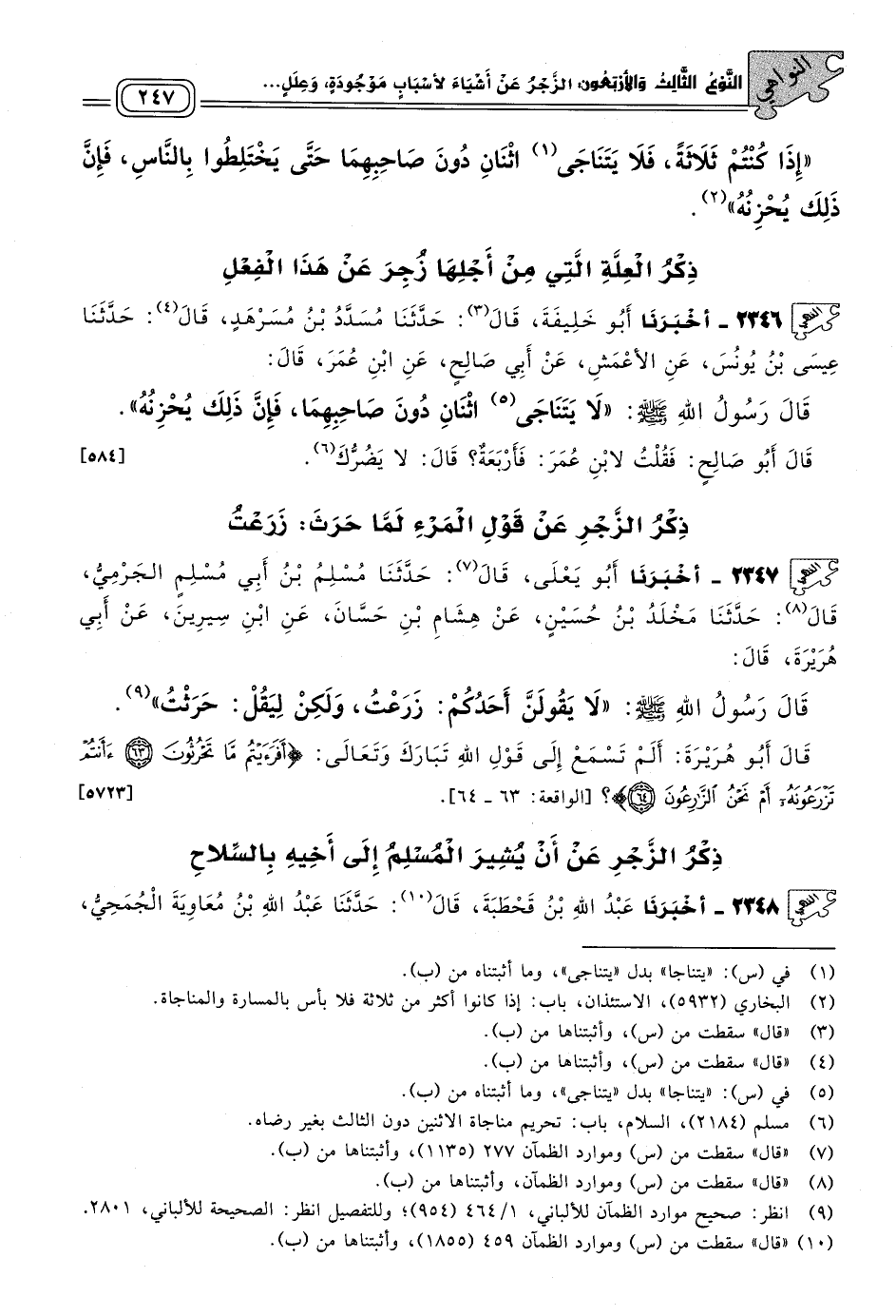 ٢٣٤٦ - أَخبَرنا أَبُو خَلِيفَةَ، قَالَ: حَدثنا مُسَدَّدُ بْنُ مُسَرْهَدٍ، قَالَ: حَدثنا عِيسَى بْنُ يُونُسَ، عَنِ الأَعْمَشِ، عَنْ أَبِي صَالِحٍ، عَنِ ابْنِ عُمَرَ، قَالَ: قَالَ رَسُولُ اللهِ صَلى الله عَلَيه وسَلم: "لَا يَتَنَاجَى اثْنَانِ دُونَ صَاحِبِهِمَا، فَإِنَّ ذَلِكَ يُحْزِنُهُ".