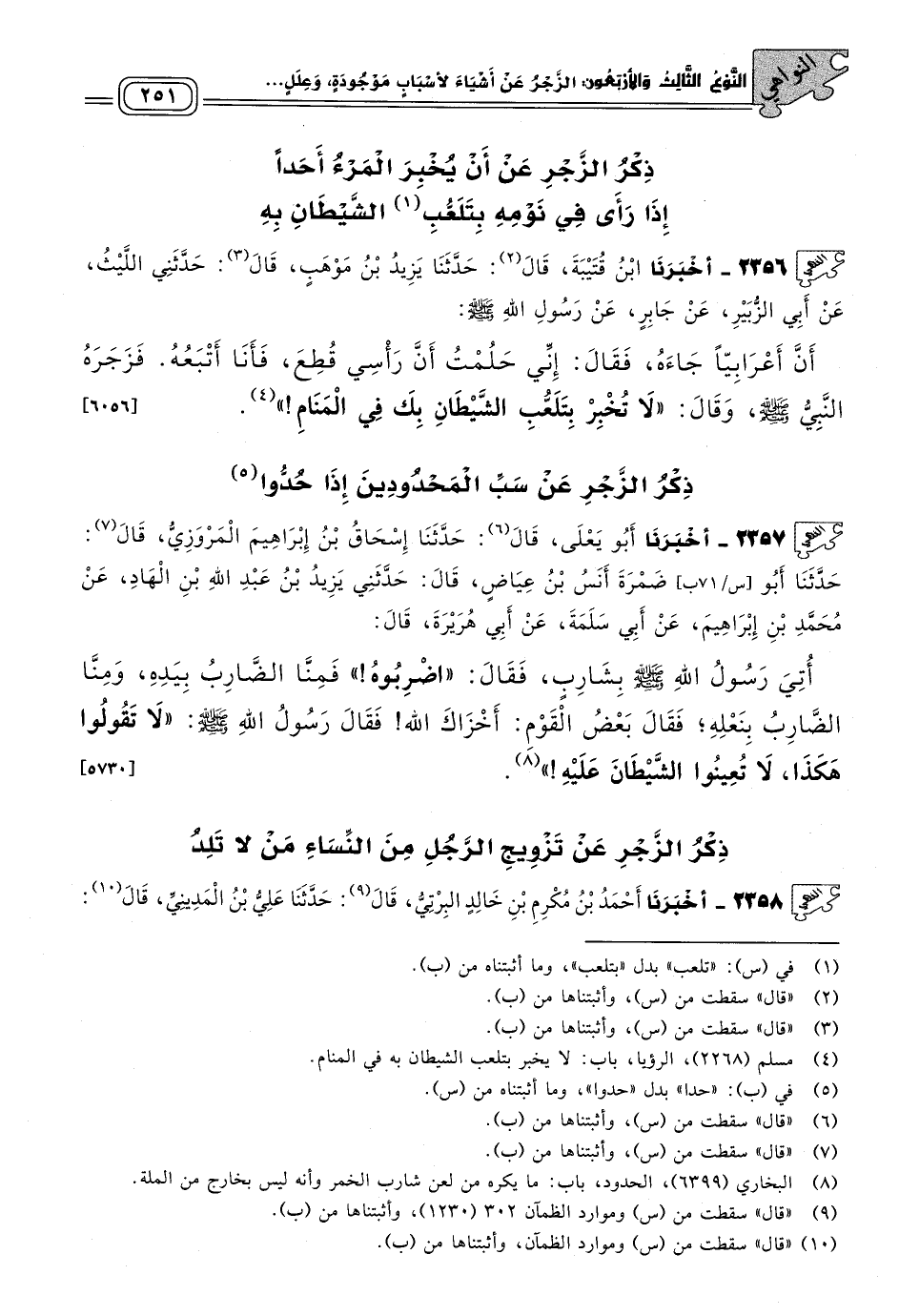 ٢٣٥٦ - أَخبَرنا ابْنُ قُتَيْبَةَ، قَالَ: حَدثنا يَزِيدُ بْنُ مَوْهَبٍ، قَالَ: حَدَّثَنِي اللَّيْثُ، عَنْ أَبِي الزُّبَيْرِ، عَنْ جَابِرٍ، عَنْ رَسُولِ اللهِ صَلى الله عَلَيه وسَلم، أَنَّ أَعْرَابِيًّا جَاءَهُ فَقَالَ: إِنِّي حَلُمْتُ أَنَّ رَأْسِيَ قُطِعَ فَأَنَا أَتْبَعُهُ، فَزَجَرَهُ النَّبِيُّ صَلى الله عَلَيه وسَلم وَقَالَ: "لَا تُخْبِرْ بِتَلَعُّبِ الشَّيْطَانِ بِكَ فِي الْمَنَامِ". [٦٠٥٦]