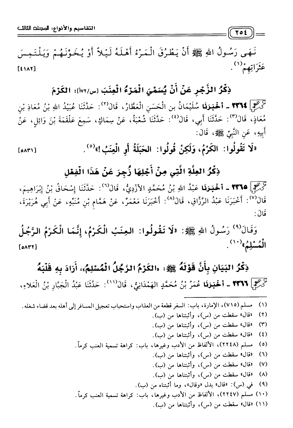 ٢٣٦٥ - أَخبَرنا عَبْدُ اللهِ بْنُ مُحَمَّدٍ الأَزْدِيُّ، قَالَ: حَدثنا إِسْحَاقُ بْنُ إِبْرَاهِيمَ، قَالَ: أَخبَرنا عَبْدُ الرَّزَّاقِ، قَالَ: أَخبَرنا مَعْمَرٌ، عَنْ هَمَّامِ بْنِ مُنَبِّهِ، عَنْ أَبِي هُرَيْرَةَ، قَالَ: وَقَالَ رَسُولُ اللهِ صَلى الله عَلَيه وسَلم: "لَا تَقُولُوا: الْعِنَبُ الْكَرْمُ، إِنَّمَا الْكَرْمُ الرَّجُلُ الْمُسْلِمُ". [٥٨٣٢]