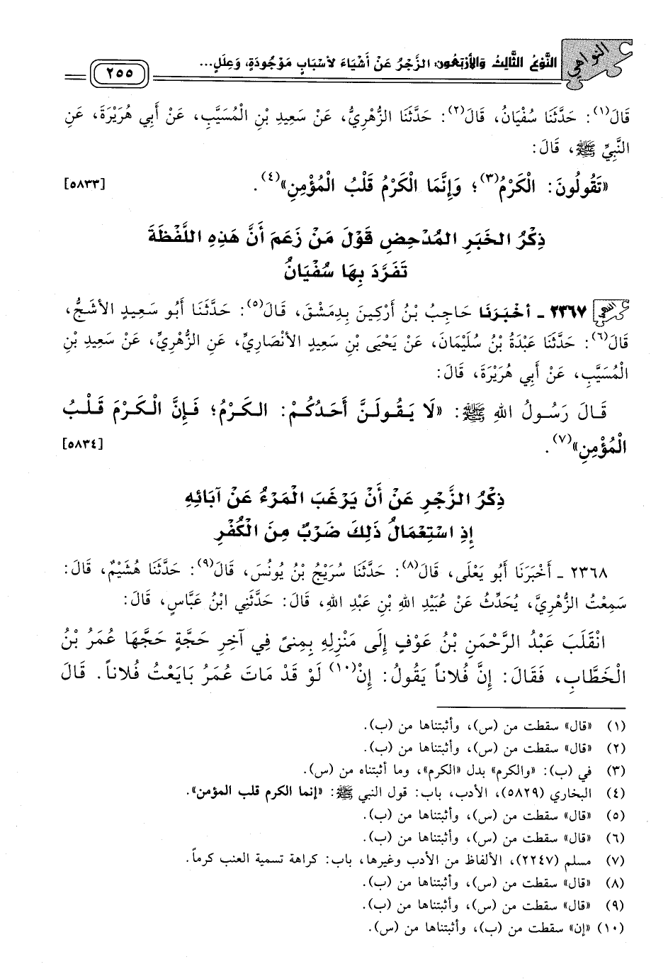 ٢٣٦٧ - أَخبَرنا حَاجِبُ بْنُ أَرَّكِينَ، بِدِمَشْقَ، قَالَ: حَدثنا أَبُو سَعِيدٍ الأَشَجُّ، قَالَ: حَدثنا عَبْدَةُ بْنُ سُلَيْمَانَ، عَنْ يَحْيَى بْنِ سَعِيدٍ الأَنْصَارِيِّ، عَنِ الزُهْرِيِّ، عَنْ سَعِيدِ بْنِ الْمُسَيَّبِ، عَنْ أَبِي هُرَيْرَةَ، قَالَ: قَالَ رَسُولُ اللهِ صَلى الله عَلَيه وسَلم: "لَا يَقُولَنَّ أَحَدُكُمُ: الْكَرْمُ، فَإِنَّ الْكَرْمَ قَلْبُ الْمُؤْمِنِ". [٥٨٣٤]