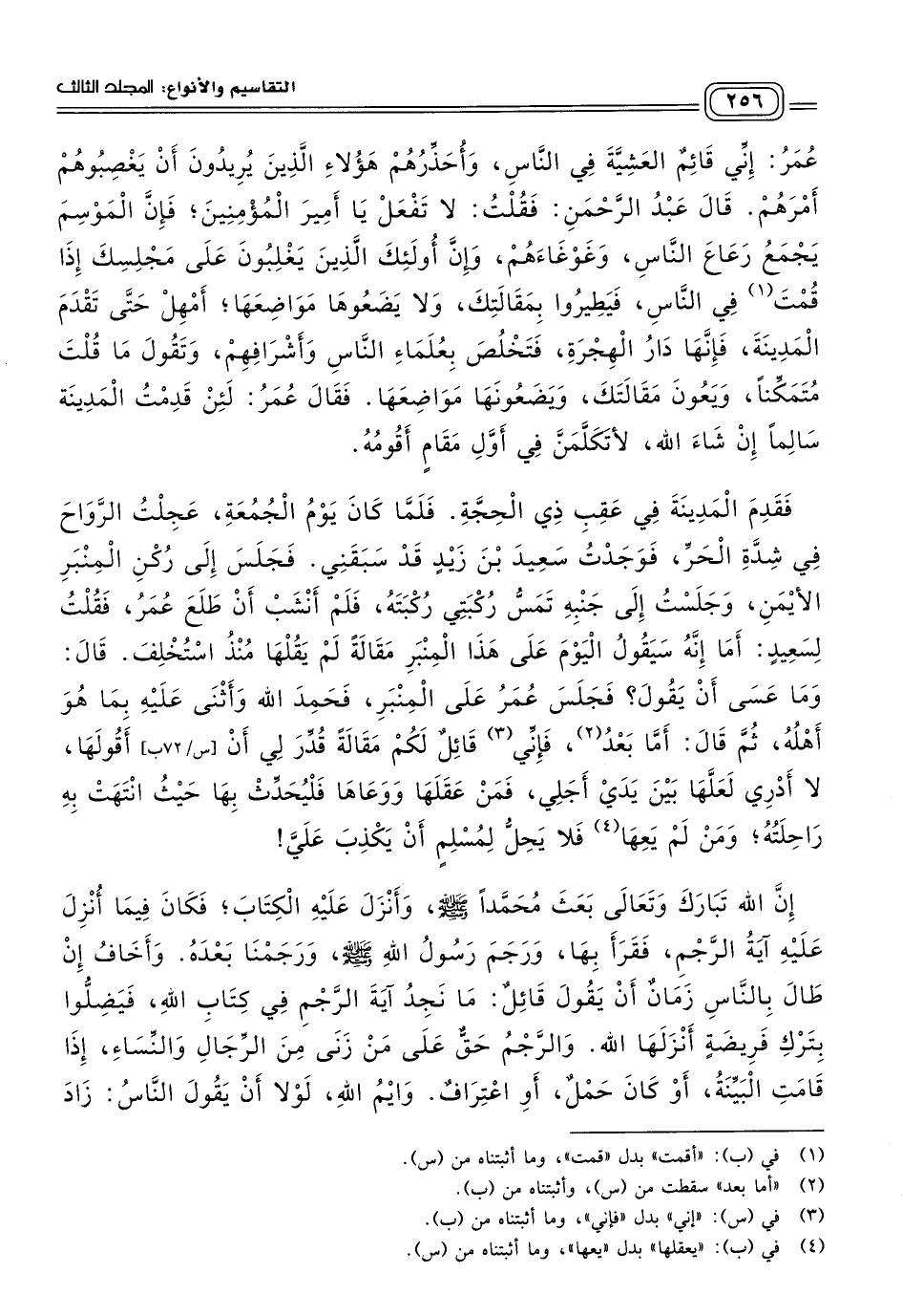 إِنَّ اللهَ تَبَارَكَ وَتَعَالَى، بَعَثَ مُحَمَّدًا صَلى الله عَلَيه وسَلم، وَأَنْزَلَ عَلَيْهِ الْكِتَابَ، فَكَانَ فِيمَا أَنْزَلَ عَلَيْهِ آيَةَ الرَّجْمِ، فَقَرَأَ بِهَا، وَرَجَمَ رَسُولُ اللهِ صَلى الله عَلَيه وسَلم، وَرَجَمْنَا بَعْدَهُ، وَأَخَافُ إِنْ طَالَ بِالنَّاسِ زَمَانٌ أَنْ يَقُولَ قَائِلٌ: مَا نَجْدُ آيَةَ الرَّجْمِ فِي كِتَابِ اللهِ، فَيَضِلُّوا بِتَرْكِ فَرِيضَةٍ أَنْزَلَهَا اللهُ، وَالرَّجْمُ حَقٌّ عَلَى مَنْ زَنَى مِنَ الرِّجَالِ وَالنِّسَاءِ، إِذَا قَامَتِ الْبَيِّنَةُ، أَوْ كَانَ حَمْلٌ، أَوِ اعْتِرَافٌ، وَايْمُ اللهِ، لَوْلَا أَنْ يَقُولَ النَّاسُ: زَادَ عُمَرُ فِي كِتَابِ اللهِ، لَكَتَبْتُهَا.