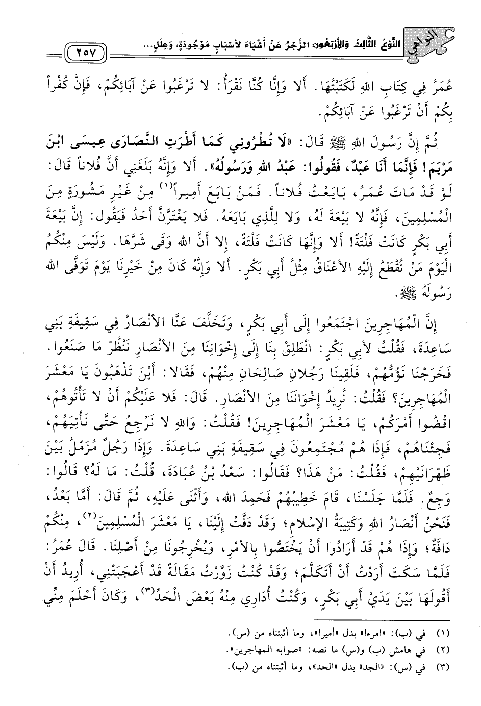 ثُمَّ إِنَّ رَسُولَ اللهِ صَلى الله عَلَيه وسَلم، قَالَ: "لَا تُطْرُونِي كَمَا أَطْرَتِ النَّصَارَى عِيسَى ابْنَ مَرْيَمَ، فَإِنَّمَا أَنَا عَبْدٌ، فَقُولُوا: عَبْدُ اللهِ وَرَسُولُهُ". أَلَا وَإِنَّهُ بَلَغَنِي أَنَّ فُلَانًا قَالَ: لَوْ قَدْ مَاتَ عُمَرُ، بَايَعْتُ فُلَانًا، فَمَنْ بَايَعَ أميرا مِنْ غَيْرِ مَشُورَةٍ مِنَ الْمُسْلِمِينَ، فَإِنَّهُ لَا بَيْعَةَ لَهُ، وَلَا لِلَّذِي بَايَعَهُ، فَلَا يَغْتَرَّنَّ أَحَدٌ فَيَقُولُ: إِنَّ بَيْعَةَ أَبِي بَكْرٍ كَانَتْ فَلْتَةً، أَلَا وَإِنَّهَا كَانَتْ فَلْتَةً، إِلَاّ أَنَّ اللهَ وَقَى شَرَّهَا. وَلَيْسَ مِنْكُمُ الْيَوْمَ مَنْ تُقْطَعُ إِلَيْهِ الأَعْنَاقُ مِثْلُ أَبِي بَكْرٍ. أَلَا وَإِنَّهُ كَانَ مِنْ خَيْرِنَا يَوْمَ تَوَفَّى اللهُ رَسُولَهُ صَلى الله عَلَيه وسَلم.