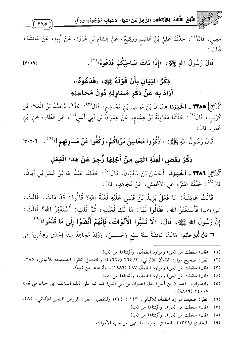 ٢٣٨٥ - أَخبَرنا عِمْرَانُ بْنُ مُوسَى بْنِ مُجَاشِعٍ، قَالَ: حَدثنا مُحَمَّدُ بْنُ الْعَلَاءِ بْنِ كُرَيْبٍ، قَالَ: حَدثنا مُعَاوِيَةُ بْنُ هِشَامٍ، عَنْ عِمْرَانَ بْنِ أَبِي أَنَسٍ، عَنْ عَطَاءٍ، عَنِ ابْنِ عُمَرَ، قَالَ: قَالَ رَسُولُ اللهِ صَلى الله عَلَيه وسَلم: "اذْكُرُوا مَحَاسِنَ مَوْتَاكُمْ وَكُفُّوا عَنْ مَسَاوِئِهِمْ". [٣٠٢٠]