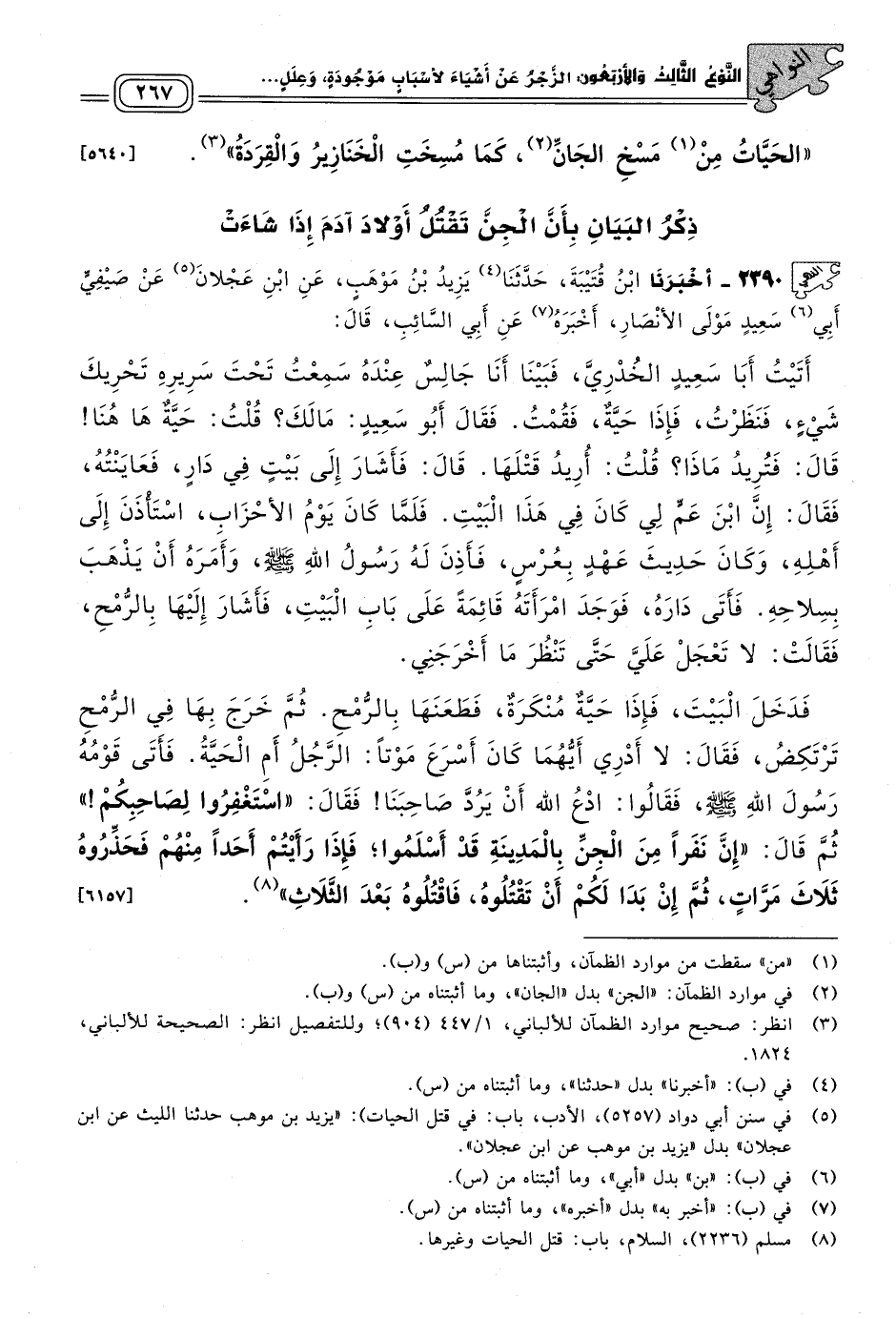 فَدَخَلَ الْبَيْتَ، فَإِذَا حَيَّةٌ مُنْكَرَةٌ، فَطَعَنَهَا بِالرُّمْحِ، ثُمَّ خَرَجَ بِهَا تَرْتَكِضُ، فَقَالَ: لَا أَدْرِي أَيَّهُمَا كَانَ أَسْرَعَ مَوْتًا: الرَّجُلُ أَمِ الْحَيَّةُ، فَأَتَى قَوْمُهُ رَسُولَ اللهِ صَلى الله عَلَيه وسَلم، فَقَالُوا: ادْعُ اللهَ أَنْ يَرُدَّ صَاحِبَنَا، فَقَالَ: "اسْتَغْفِرُوا لِصَاحِبِكُمْ"، ثُمَّ قَالَ: "إِنَّ نَفَرًا مِنَ الْجِنِّ بِالْمَدِينَةِ قَدْ أَسْلَمُوا، فَإِذَا رَأَيْتُمْ أَحَدًا مِنْهُمْ فَحَذِّرُوهُ ثَلَاثَ مَرَّاتٍ، ثُمَّ إِنْ بَدَا لَكُمْ أَنْ تَقْتُلُوهُ فَاقْتُلُوهُ بَعْدَ الثَّلَاثِ". [٦١٥٧]