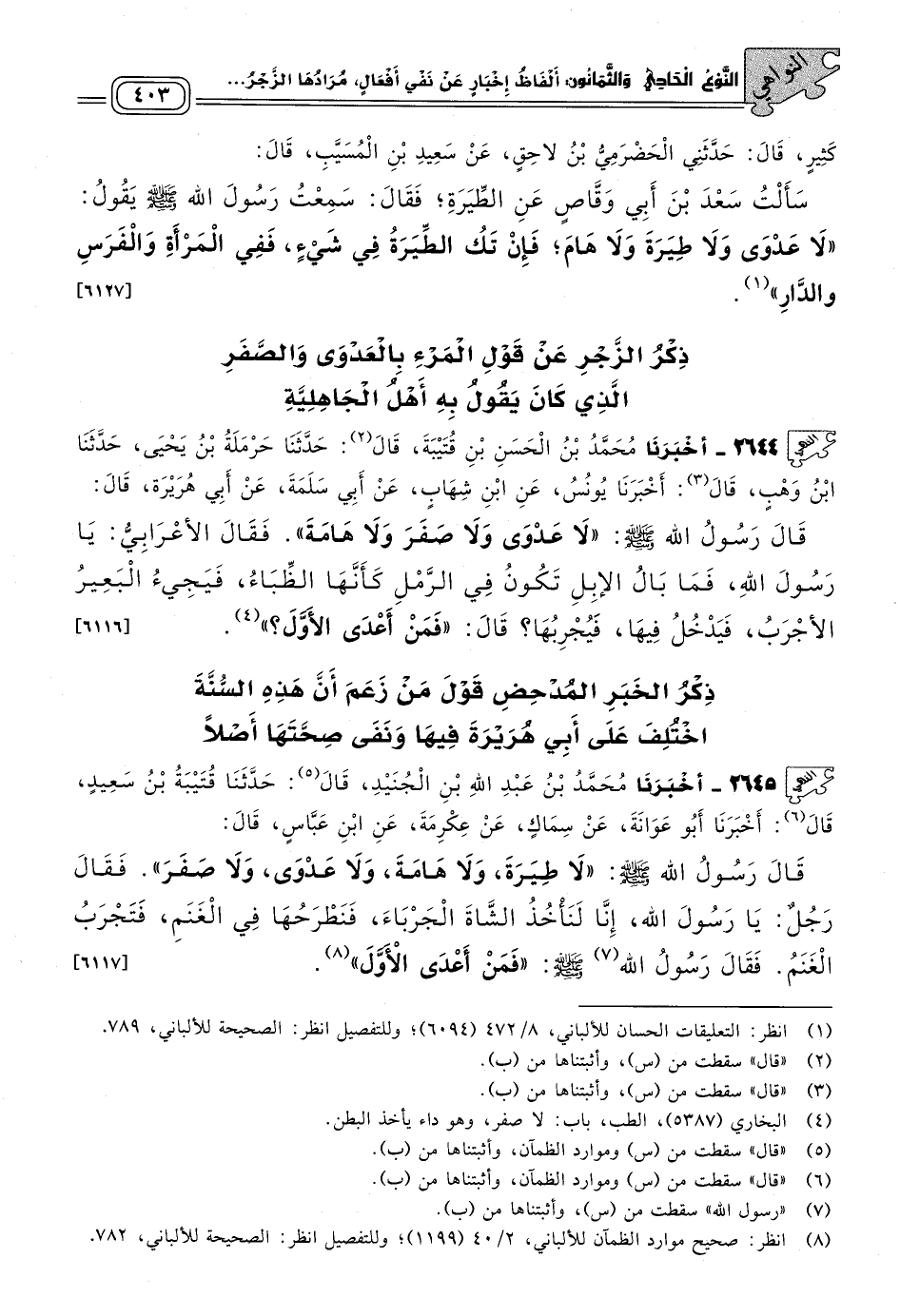 ذِكْرُ الزَّجْرِ عَنْ قَوْلِ الْمَرْءِ بِالْعَدْوَى وَالصَّفَرِ الَّذِي كَانَ يَقُولُ بِهِ أَهْلُ الْجَاهِلِيَّةِ.