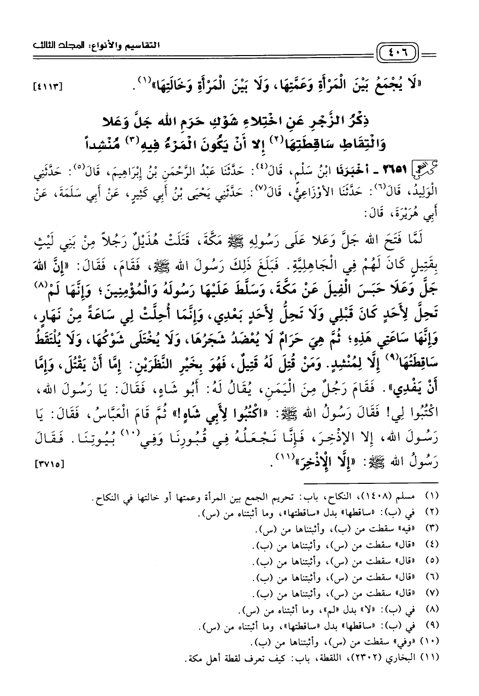 ٢٦٥١ - أَخبَرنا ابْنُ سَلْمٍ، قَالَ: حَدثنا عَبْدُ الرَّحْمَنِ بْنُ إِبْرَاهِيمَ، قَالَ: حَدَّثَنِي الْوَلِيدُ، قَالَ: حَدثنا الأَوْزَاعِيُّ، قَالَ: حَدَّثَنِي يَحْيَى بْنُ أَبِي كَثِيرٍ، عَنْ أَبِي سَلَمَةَ، عَنْ أَبِي هُرَيْرَةَ، قَالَ: لَمَّا فَتْحَ اللهُ جَلَّ وَعَلَا عَلَى رَسُولِهِ صَلى الله عَلَيه وسَلم مَكَّةَ، قَتَلَتْ هُذَيْلٌ رَجُلاً مِنْ بَنِي لَيْثٍ بِقَتِيلٍ كَانَ لَهُمْ فِي الْجَاهِلِيَّةِ، فَبَلَغَ ذَلِكَ رَسُولَ اللهِ صَلى الله عَلَيه وسَلم، فَقَامَ، فَقَالَ: "إِنَّ اللهَ جَلَّ وَعَلَا حَبَسَ الْفِيلَ عَنْ مَكَّةَ، وَسَلَّطَ عَلَيْهَا رَسُولَهُ وَالْمُؤْمِنِينَ، وَإِنَّهَا لم تَحِلَّ لأَحَدٍ كَانَ قَبْلِي، وَلَا تَحِلُّ لأَحَدٍ بَعْدِي، وَإِنَّمَا أُحِلَّتْ لِي سَاعَةً مِنْ نَهَارٍ، وَإِنَّهَا سَاعَتِي هَذِهِ، ثُمَّ هِيَ حَرَامٌ، لَا يُعْضَدُ شَجَرُهَا، وَلَا يُخْتَلَى شَوْكُهَا، وَلَا يُلْتَقَطُ سَاقِطَتُهَا إِلَاّ لِمُنْشِدٍ، وَمَنْ قُتِلَ لَهُ قَتِيلٌ، فَهُوَ بِخَيْرِ النَّظَرَيْنِ، إِمَّا أَنْ يَقْتُلَ، وَإِمَّا أَنْ يَفْدِيَ"، فَقَامَ رَجُلٌ مِنَ الْيَمَنِ يُقَالُ لَهُ: أَبُو شَاهٍ، فَقَالَ: يَا رَسُولَ اللهِ، اكْتُبُوا لِي، فَقَالَ رَسُولُ اللهِ صَلى الله عَلَيه وسَلم: "اكْتُبُوا لأَبِي شَاهٍ"، ثُمَّ قَامَ الْعَبَّاسُ فَقَالَ: يَا رَسُولَ اللهِ، إِلَاّ الإِذْخِرَ، فَإِنَّا نَجْعَلُهُ فِي قُبُورِنَا، وَفِي بُيُوتِنَا، فَقَالَ رَسُولُ اللهِ صَلى الله عَلَيه وسَلم: "إِلَاّ الإِذْخِرَ". [٣٧١٥]