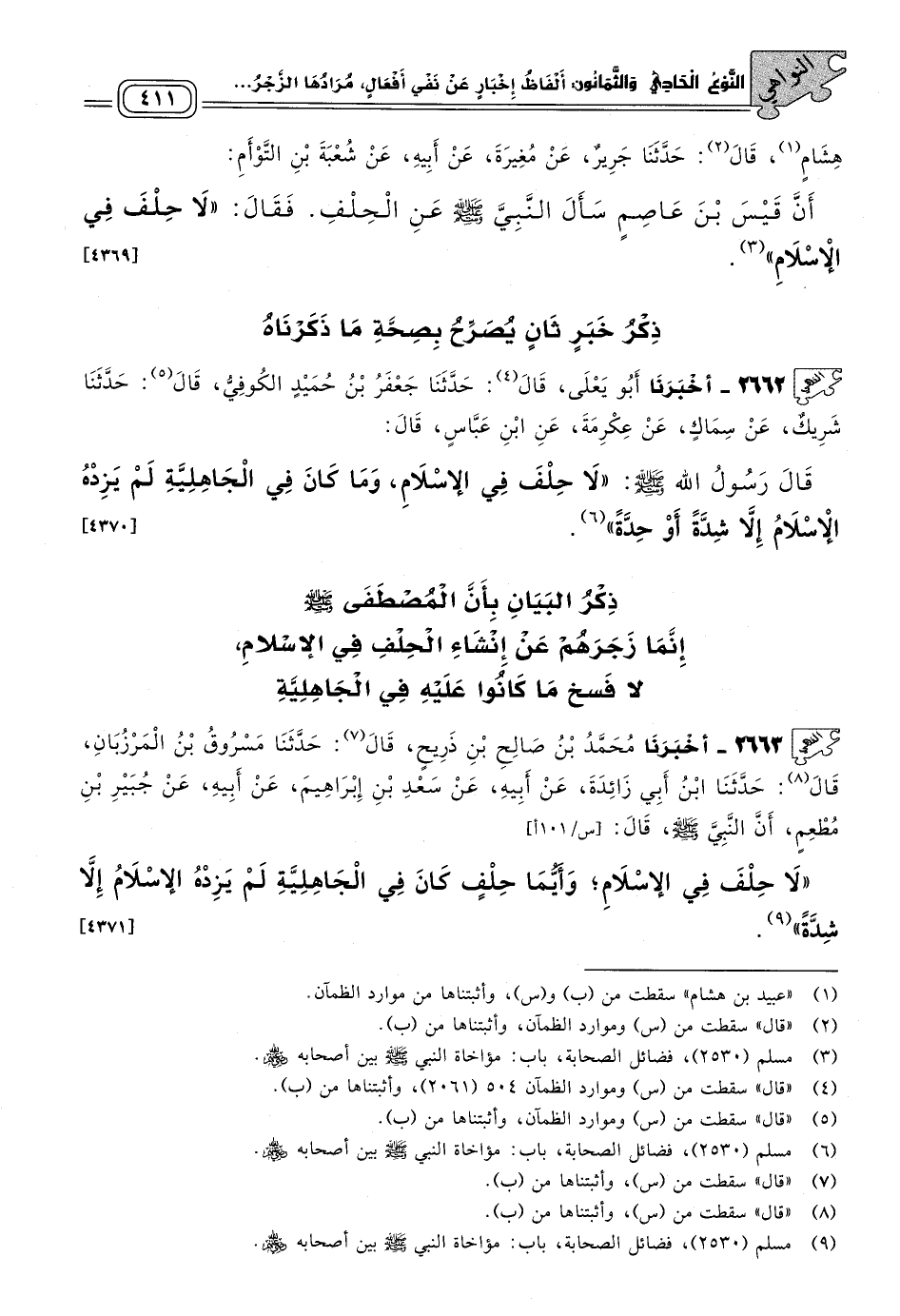ذِكْرُ الْبَيَانِ بِأَنَّ الْمُصْطَفَى صَلى الله عَلَيه وسَلم إِنَّمَا زَجَرَهُمْ عَنْ إِنْشَاءِ الْحِلْفِ فِي الإِسْلَامِ، لَا فَسْخَ مَا كَانُوا عَلَيْهِ فِي الْجَاهِلِيَّةِ.