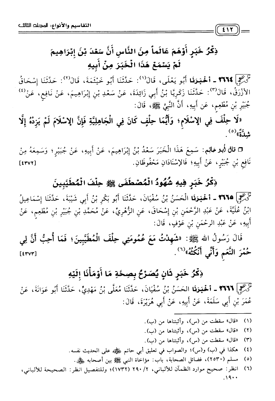 قَالَ أَبُو حَاتِمٍ: أَضْمَرَ فِي هَذَيْنِ الْخَبَرَيْنِ "مِنْ"، يُرِيدُ بِهِ: شَهِدْتُ مِنْ حِلْفِ الْمُطَيَّبِينَ لأَنَّهُ صَلى الله عَلَيه وسَلم لَمْ يَشْهَدْ حِلْفَ الْمُطَيَّبِينَ، لأَنَّ حِلْفَ الْمُطَيَّبِينَ كَانَ قَبْلَ مَوْلِدِ رَسُولِ اللهِ صَلى الله عَلَيه وسَلم، وَإِنَّمَا شَهِدَ رَسُولُ اللهِ صَلى الله عَلَيه وسَلم حِلْفَ الْفُضُولِ، وَهُمْ مِنَ الْمُطَيَّبِينَ، قَدْ ذَكَرْتُ الْكَلَامَ عَلَى هَذَا الْخَبَرِ بِتَفْصِيلٍ فِي كِتَابِ: التَّوْرِيث وَالْحُجُبِ. [٤٣٧٤]