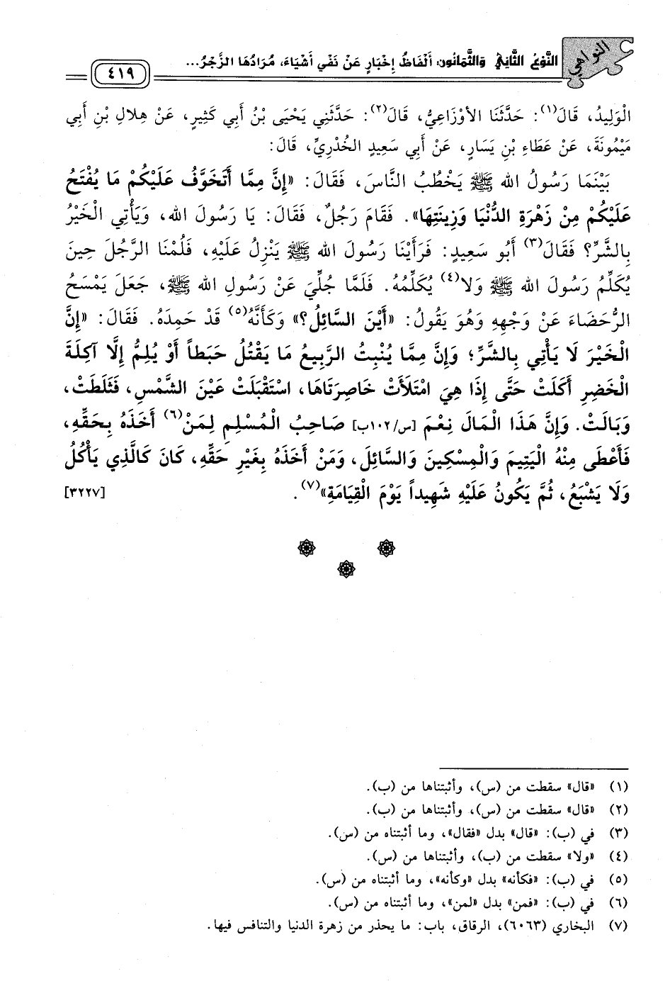 فَلُمْنَا الرَّجُلَ حِينَ يُكَلِّمُ رَسُولَ اللهِ صَلى الله عَلَيه وسَلم وَلَا يُكَلِّمُهُ، فَلَمَّا جُلِّيَ عَنْ رَسُولِ اللهِ صَلى الله عَلَيه وسَلم، جَعَلَ يَمْسَحُ الرُّحَضَاءَ عَنْ وَجْهِهِ وَهُوَ يَقُولُ: "أَيْنَ السَّائِلُ؟ " وَكَأَنَّهُ قَدْ حَمِدَهُ، فَقَالَ: "إِنَّ الْخَيْرَ لَا يَأْتِي بِالشَّرِّ، وَإِنَّ مِمَّا يُنْبِتُ الرَّبِيعُ مَا يَقْتُلُ حَبَطًا، أَوْ يُلِمُّ إِلَاّ آكِلَةَ الْخَضِرِ أَكَلَتْ حَتَّى إِذَا هِيَ امْتَلأَتْ خَاصِرَتَاهَا اسْتَقْبَلَتْ عَيْنَ الشَّمْسِ، فَثَلَطَتْ وَبَالَتْ، وَإِنَّ هَذَا الْمَالَ نِعْمَ صَاحِبُ الْمُسْلِمِ لِمَنْ أَخَذَهُ بِحَقِّهِ، فَأَعْطَى مِنْهُ الْيَتِيمَ وَالْمِسْكِينَ وَالسَّائِلَ، وَمَنْ أَخَذَهُ بِغَيْرِ حَقِّهِ كَانَ كَالَّذِي يَأْكُلُ وَلَا يَشْبَعُ، ثُمَّ يَكُونُ عَلَيْهِ شَهِيدًا يَوْمَ الْقِيَامَةِ". [٣٢٢٧]