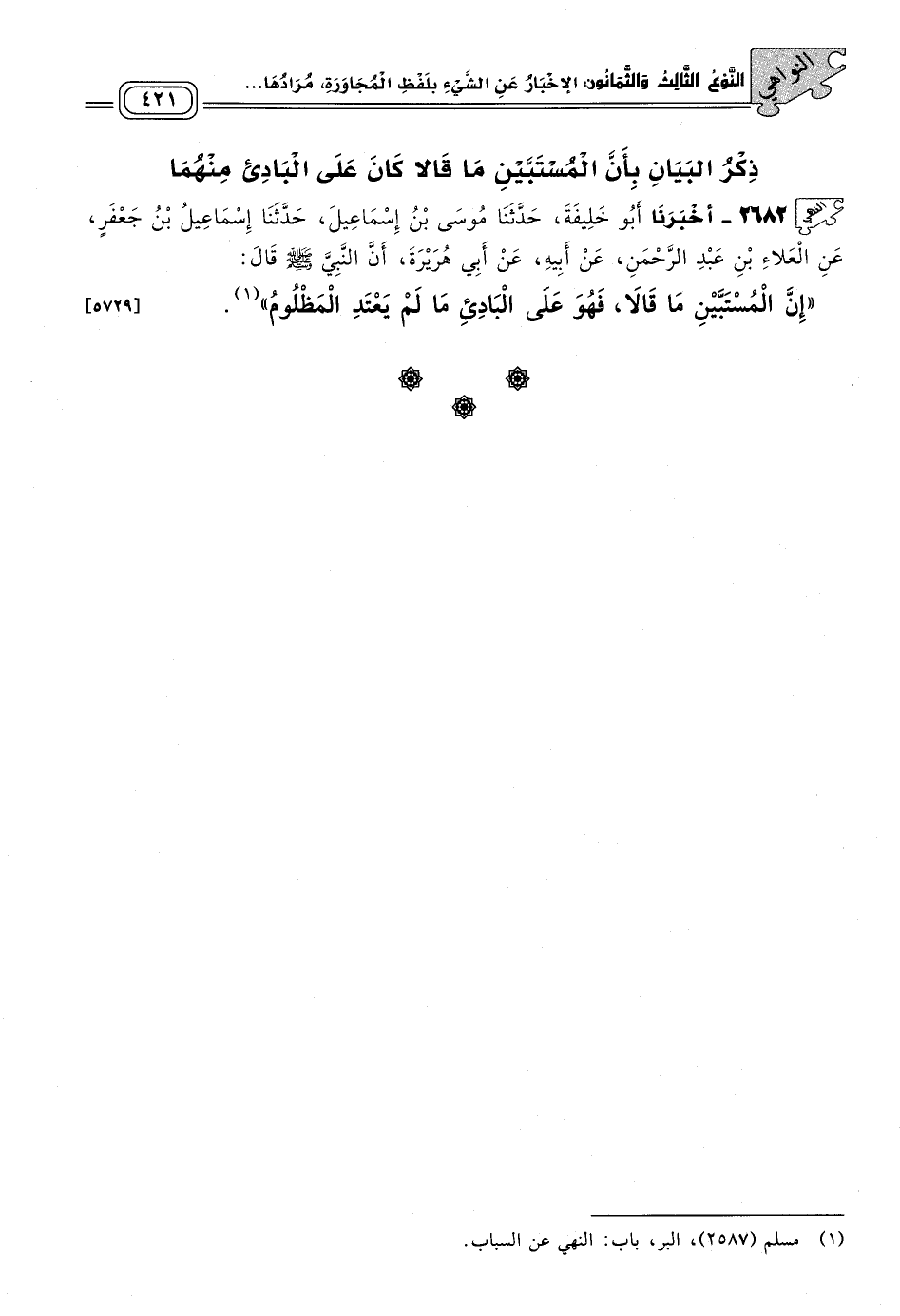 ٢٦٨٢ - أَخبَرنا أَبُو خَلِيفَةَ، حَدثنا مُوسَى بْنُ إِسْمَاعِيلَ، حَدثنا إِسْمَاعِيلُ بْنُ جَعْفَرٍ، عَنِ الْعَلَاءِ بْنِ عَبْدِ الرَّحْمَنِ، عَنْ أَبِيهِ، عَنْ أَبِي هُرَيْرَةَ، أَنَّ النَّبِيَّ صَلى الله عَلَيه وسَلم قَالَ: "إِنَّ الْمُسْتَبَّيْنَ مَا قَالَا، فَهُوَ عَلَى الْبَادِئِ مَا لَمْ يَعْتَدِ الْمَظْلُومُ". [٥٧٢٩]