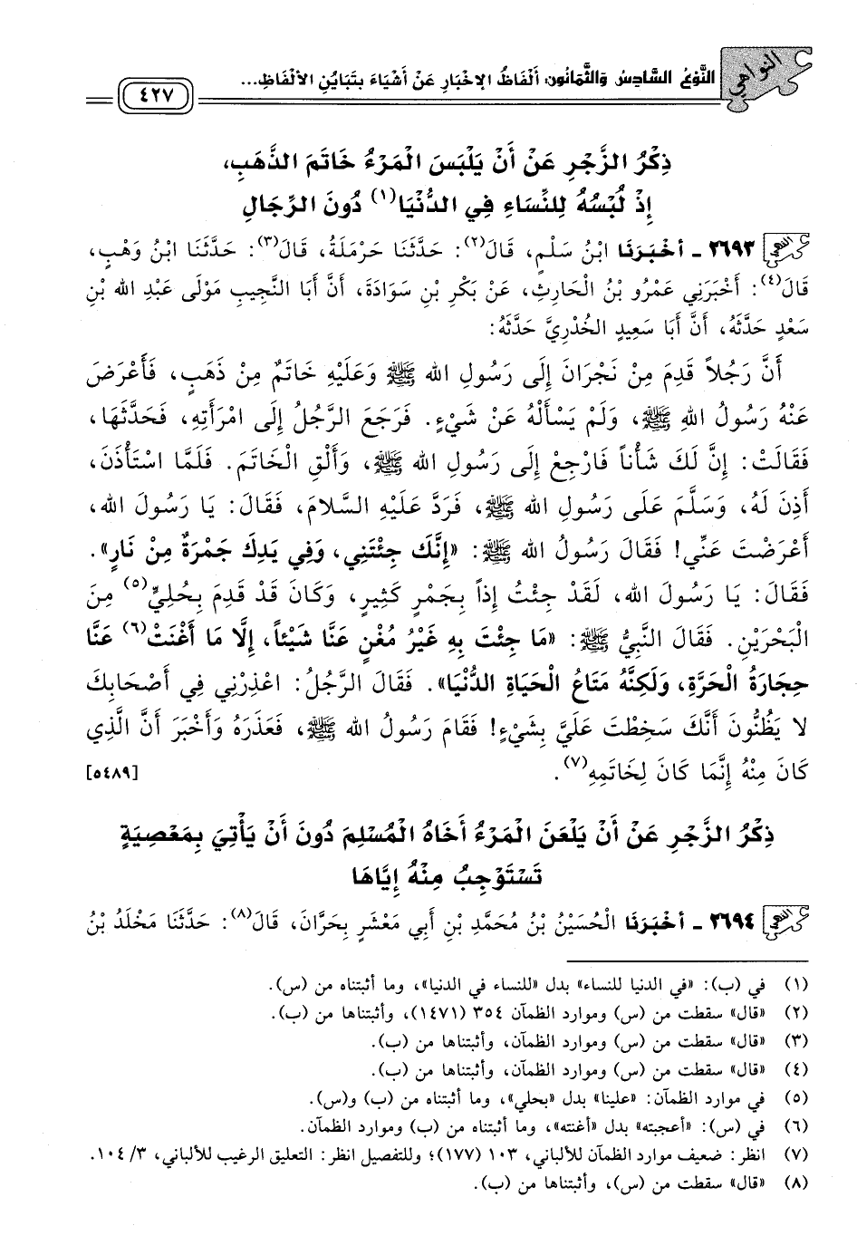 ٢٦٩٣ - أَخبَرنا ابْنُ سَلْمٍ، قَالَ: حَدثنا حَرْمَلَةُ، قَالَ: حَدثنا ابْنُ وَهْبٍ، قَالَ: أَخْبَرَنِي عَمْرُو بْنُ الْحَارِثِ، عَنْ بَكْرِ بْنِ سَوَادَةَ، أَنَّ أَبَا النَّجِيبِ، مَوْلَى عَبْدِ اللهِ بْنِ سَعْدٍ حَدَّثَهُ، أَنَّ أَبَا سَعِيدٍ الْخُدْرِيَّ حَدَّثَهُ، أَنَّ رَجُلاً قَدِمَ مِنْ نَجْرَانَ إِلَى رَسُولِ اللهِ صَلى الله عَلَيه وسَلم وَعَلَيْهِ خَاتَمٌ مِنْ ذَهَبٍ، فَأَعْرَضَ عَنْهُ رَسُولُ اللهِ صَلى الله عَلَيه وسَلم وَلَمْ يَسْأَلْهُ عَنْ شَيْءٍ، فَرَجَعَ الرَّجُلُ إِلَى امْرَأَتِهِ، فَحَدَّثَهَا، فَقَالَتْ: إِنَّ لَكَ شَأْنًا، فَارْجِعْ إِلَى رَسُولِ اللهِ صَلى الله عَلَيه وسَلم وَأَلْقِ الْخَاتَمَ، فَلَمَّا اسْتَأْذَنَ أَذِنَ لَهُ، وَسَلَّمَ عَلَى رَسُولِ اللهِ صَلى الله عَلَيه وسَلم، فَرَدَّ عَلَيْهِ السَّلَامَ، فَقَالَ: يَا رَسُولَ اللهِ، أَعْرَضْتَ عَنِّي! فَقَالَ رَسُولُ اللهِ صَلى الله عَلَيه وسَلم: "إِنَّكَ جِئْتَنِيَ وَفِي يَدِكَ جَمْرَةٌ مِنْ نَارٍ"، فَقَالَ: يَا رَسُولَ اللهِ، لَقَدْ جِئْتُ إِذًا بِجَمْرٍ كَثِيرٍ، وَكَانَ قَدْ قَدِمَ بِحُلِيٍّ مِنَ الْبَحْرَيْنِ، فَقَالَ النَّبِيُّ صَلى الله عَلَيه وسَلم: "مَا جِئْتَ بِهِ غَيْرُ مُغْنٍ عَنَّا شَيْئًا، إِلَاّ مَا أَغْنَتْ عَنَّا حِجَارَةُ الْحَرَّةِ، وَلَكِنَّهُ مَتَاعُ الْحَيَاةِ الدُّنْيَا"، فَقَالَ الرَّجُلُ: اعْذُرْنِي فِي أَصْحَابِكَ لَا يَظُنُّونَ أَنَّكَ سَخِطْتَ عَلَيَّ بِشَيْءٍ، فَقَامَ رَسُولُ اللهِ صَلى الله عَلَيه وسَلم فَعَذَرَهُ، وَأَخْبَرَ أَنَّ الَّذِي كَانَ مِنْهُ إِنَّمَا كَانَ لِخَاتَمِهِ. [٥٤٨٩]