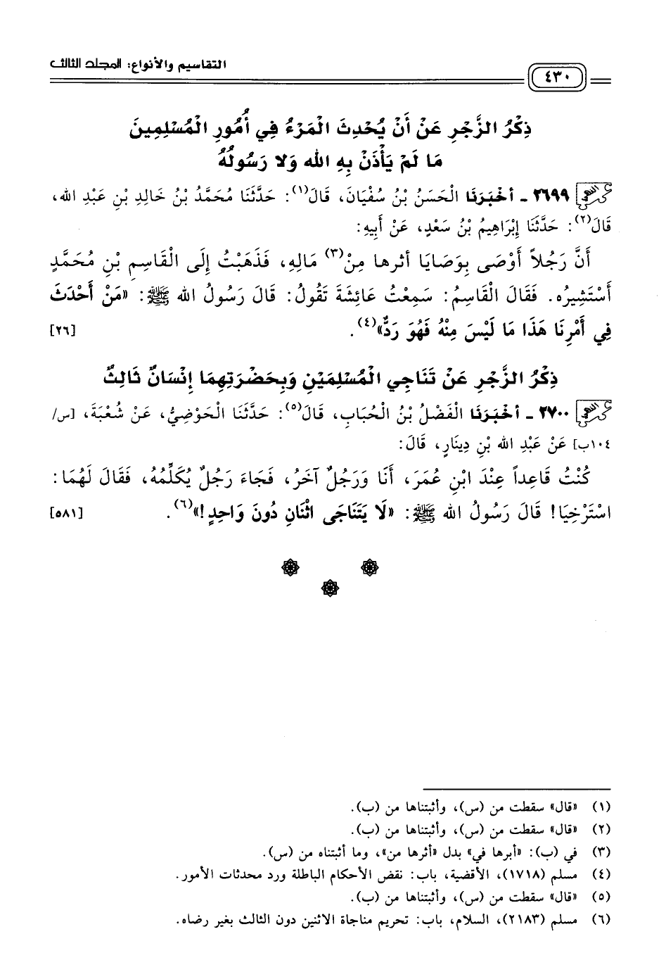 ٢٦٩٩ - أَخبَرنا الْحَسَنُ بْنُ سُفْيَانَ، قَالَ: حَدثنا مُحَمَّدُ بْنُ خَالِدِ بْنِ عَبْدِ اللهِ، قَالَ: حَدثنا إِبْرَاهِيمُ بْنُ سَعْدٍ، عَنْ أَبِيهِ، أَنَّ رَجُلاً أَوْصَى بِوَصَايَا أثرها من مَالِهِ، فَذَهَبْتُ إِلَى الْقَاسِمِ بْنِ مُحَمَّدٍ أَسْتَشِيرُهُ، فَقَالَ الْقَاسِمُ: سَمِعْتُ عَائِشَةَ، تَقُولُ: قَالَ رَسُولُ اللهِ صَلى الله عَلَيه وسَلم: "مَنْ أَحْدَثَ فِي أَمْرِنَا هَذَا مَا لَيْسَ مِنْهُ، فَهُوَ رَدٌّ". [٢٦]