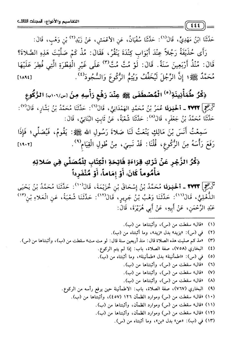 ذِكْرُ طُمَأْنِينَةِ الْمُصْطَفَى صَلى الله عَلَيه وسَلم عِنْدَ رَفْعِ رَأْسِهِ مِنَ الرُّكُوعِ.