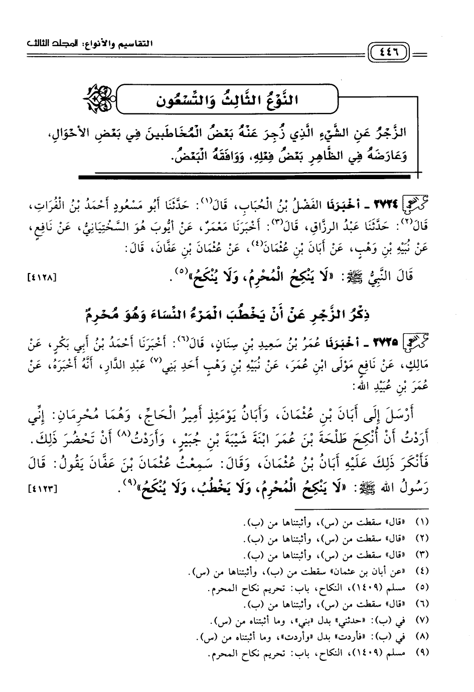 ٢٧٢٥ - أَخبَرنا عُمَرُ بْنُ سَعِيدِ بْنِ سِنَانٍ، قَالَ: أَخبَرنا أَحْمَدُ بْنُ أَبِي بَكْرٍ، عَنْ مَالِكٍ، عَنْ نَافِعٍ مَوْلَى ابْنِ عُمَرَ، عَنْ نُبَيْهِ بْنِ وَهْبٍ أَحَدِ بَنِي عَبْدِ الدَّارِ، أَنَّهُ أَخْبَرَهُ عَنْ عُمَرَ بْنِ عُبَيْدِ اللهِ، أَرْسَلَ إِلَى أَبَانَ بْنِ عُثْمَانَ، وَأَبَانُ يَوْمَئِذٍ أَمِيرُ الْحَاجِّ، وَهُمَا مُحْرِمَانِ: إِنِّي أَرَدْتُ أَنْ أُنْكِحَ طَلْحَةَ بْنَ عُمَرَ ابْنَةَ شَيْبَةَ بْنِ جُبَيْرٍ، وَأَرَدْتُ أَنْ تَحْضُرَ ذَلِكَ، فَأَنْكَرَ ذَلِكَ عَلَيْهِ أَبَانُ بْنُ عُثْمَانَ، وَقَالَ: سَمِعْتُ عُثْمَانَ بْنَ عَفَّانَ يَقُولُ: قَالَ رَسُولُ اللهِ صَلى الله عَلَيه وسَلم: "لَا يَنْكِحُ الْمُحْرِمُ، وَلَا يَخْطُبُ، وَلَا يُنْكِحُ". [٤١٢٣]