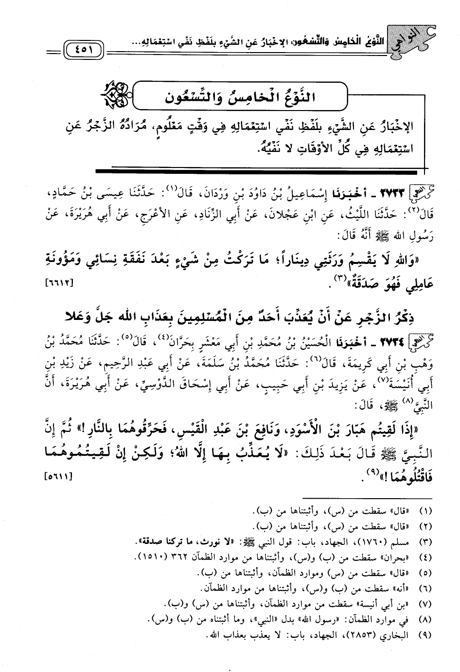 ٢٧٣٤ - أَخبَرنا الْحُسَيْنُ بْنُ مُحَمَّدِ بْنِ أَبِي مَعْشَرٍ بحران، قَالَ: حَدثنا مُحَمَّدُ بْنُ وَهْبِ بْنِ أَبِي كَرِيمَةَ، قَالَ: حَدثنا مُحَمَّدُ بْنُ سَلَمَةَ، عَنْ أَبِي عَبْدِ الرَّحِيمِ، عَنْ زَيْدِ بْنِ أَبِي أُنَيْسَةَ، عَنْ يَزِيدَ بْنِ أَبِي حَبِيبٍ، عَنْ أَبِي إِسْحَاقَ الدَّوْسِيِّ، عَنْ أَبِي هُرَيْرَةَ، أَنَّ النَّبِيَّ صَلى الله عَلَيه وسَلم قَالَ: "إِذَا لَقِيتُمْ هَبَّارَ بْنَ الأَسْوَدِ، وَنَافِعَ بْنَ عَبْدِ الْقَيْسِ فَحَرِّقُوهُمَا بِالنَّارِ"، ثُمَّ إِنَّ النَّبِيَّ صَلى الله عَلَيه وسَلم قَالَ بَعْدَ ذَلِكَ: "لَا يُعَذِّبُ بِهَا إِلَاّ اللهُ، وَلَكِنْ إِن لَقِيتُمُوهُمَا فَاقْتُلُوهُمَا". [٥٦١١]