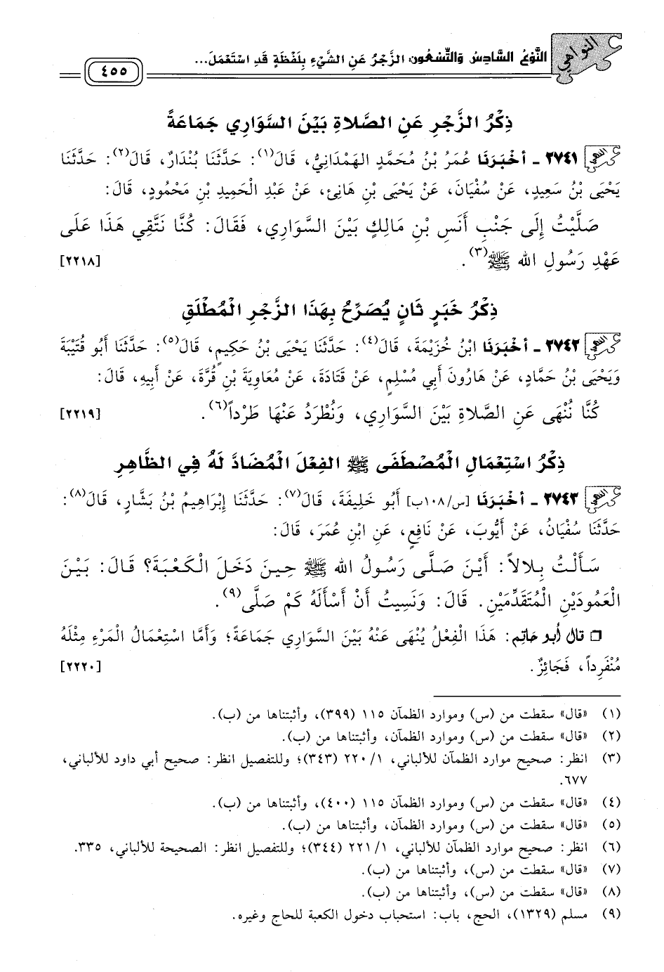 قَالَ أَبُو حَاتِمٍ: هَذَا الْفِعْلُ يُنْهَى عَنْهُ بَيْنَ السَّوَارِي جَمَاعَةً، وَأَمَّا اسْتِعْمَالُ الْمَرْءِ مِثْلَهُ مُنْفَرِدًا فَجَائِزٌ. [٢٢٢٠]