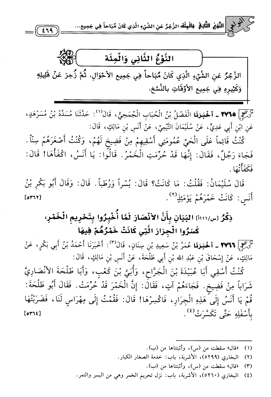 ٢٧٦٦ - أَخبَرنا عُمَرُ بْنُ سَعِيدِ بْنِ سِنَانٍ، قَالَ: أَخبَرنا أَحْمَدُ بْنُ أَبِي بَكْرٍ، عَنْ مَالِكٍ، عَنْ إِسْحَاقَ بْنِ عَبْدِ اللهِ بْنِ أَبِي طَلْحَةَ، عَنْ أَنَسِ بْنِ مَالِكٍ، قَالَ: كُنْتُ أَسْقِي أَبَا عُبَيْدَةَ بْنَ الْجَرَّاحِ، وَأُبَيَّ بْنَ كَعْبٍ، وَأَبَا طَلْحَةَ الأَنْصَارِيَّ شَرَابًا مِنْ فَضِيخٍ، فَجَاءَهُمْ آتٍ، فَقَالَ: إِنَّ الْخَمْرَ قَدْ حُرِّمَتْ، فَقَالَ أَبُو طَلْحَةَ: قُمْ يَا أَنَسُ إِلَى هَذِهِ الْجِرَارِ فَاكْسِرْهَا، قَالَ: فَقُمْتُ إِلَى مِهْرَاسٍ لَنَا فَضَرَبْتُهَا بِأَسْفَلِهِ حَتَّى تَكَسَّرَتْ. [٥٣٦٤]