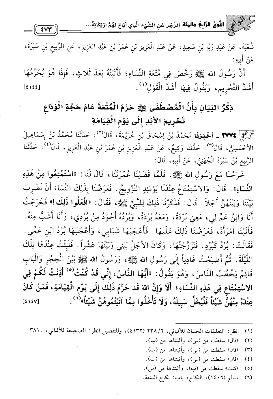 ٢٧٧٤ - أَخبَرنا مُحَمَّدُ بْنُ إِسْحَاقَ بْنِ خُزَيْمَةَ، قَالَ: حَدثنا مُحَمَّدُ بْنُ إِسْمَاعِيلَ الأَحْمَسِيُّ، قَالَ: حَدثنا وَكِيعٌ، عَنْ عَبْدِ الْعَزِيزِ بْنِ عُمَرَ بْنِ عَبْدِ الْعَزِيزِ، قَالَ: حَدثنا الرَّبِيعُ بْنُ سَبْرَةَ الْجُهَنِيُّ، عَنْ أَبِيهِ قَالَ: خَرَجْنَا مَعَ رَسُولِ اللهِ صَلى الله عَلَيه وسَلم فَلَمَّا قَضَيْنَا عُمْرَتَنَا قَالَ لَنَا: "اسْتَمْتِعُوا مِنْ هَذِهِ النِّسَاءِ"، قَالَ: وَالاِسْتِمْتَاعُ عِنْدَنَا يَوْمَئِذٍ التَّزْوِيجُ فَعَرَضْنَا بِذَلِكَ النِّسَاءُ أَنْ نَضْرِبَ بَيْنَنَا وَبَيْنَهُنَّ أَجَلاً، قَالَ: فَذَكَرْنَا ذَلِكَ لِلنَّبِيِّ صَلى الله عَلَيه وسَلم فَقَالَ: "افْعَلُوا ذَلِكَ" فَخَرَجْتُ أَنَا وَابْنُ عَمٍّ لِي مَعِي بُرْدَةٌ وَمَعَهُ بُرْدَةٌ، وَبُرْدُهُ أَجْوَدُ مِنْ بُرْدِي، وَأَنَا أَشَبُّ مِنْهُ، فَأَتَيْنَا امْرَأَةً فَعَرَضْنَا ذَلِكَ عَلَيْهَا فَأَعْجَبَهَا شَبَابِي، وَأَعْجَبَهَا بُرْدُ ابْنِ عَمِّي، فَقَالَتْ: بُرْدٌ كَبُرْدٍ فَتَزَوَّجْتُهَا، وَكَانَ الأَجَلُ بَيْنِي وَبَيْنَهَا عَشْرًا، فَلَبِثْتُ عِنْدَهَا تِلْكَ اللَّيْلَةَ، ثُمَّ أَصْبَحْتُ غَادِيًا إِلَى رَسُولِ اللهِ صَلى الله عَلَيه وسَلم، وَرَسُولُ اللهِ صَلى الله عَلَيه وسَلم بَيْنَ الْحِجْرِ وَالْبَابِ قَائِمٌ يَخْطُبُ النَّاسَ وَهُوَ يَقُولُ: "أَيُّهَا النَّاسُ إِنِّي قَدْ كنت أَذِنْتُ لَكُمْ فِي الاِسْتِمْتَاعِ فِي هَذِهِ النِّسَاءِ، أَلَا وَإِنَّ اللهَ قَدْ حَرَّمَ ذَلِكَ إِلَى يَوْمِ الْقِيَامَةِ فَمَنْ كَانَ عِنْدَهُ مِنْهُنَّ شَيْئًا فَلْيُخَلِّ سَبِيلَهُ، وَلَا تَأْخُذُوا مِمَّا آتَيْتُمُوهُنَّ شَيْئًا". [٤١٤٧]