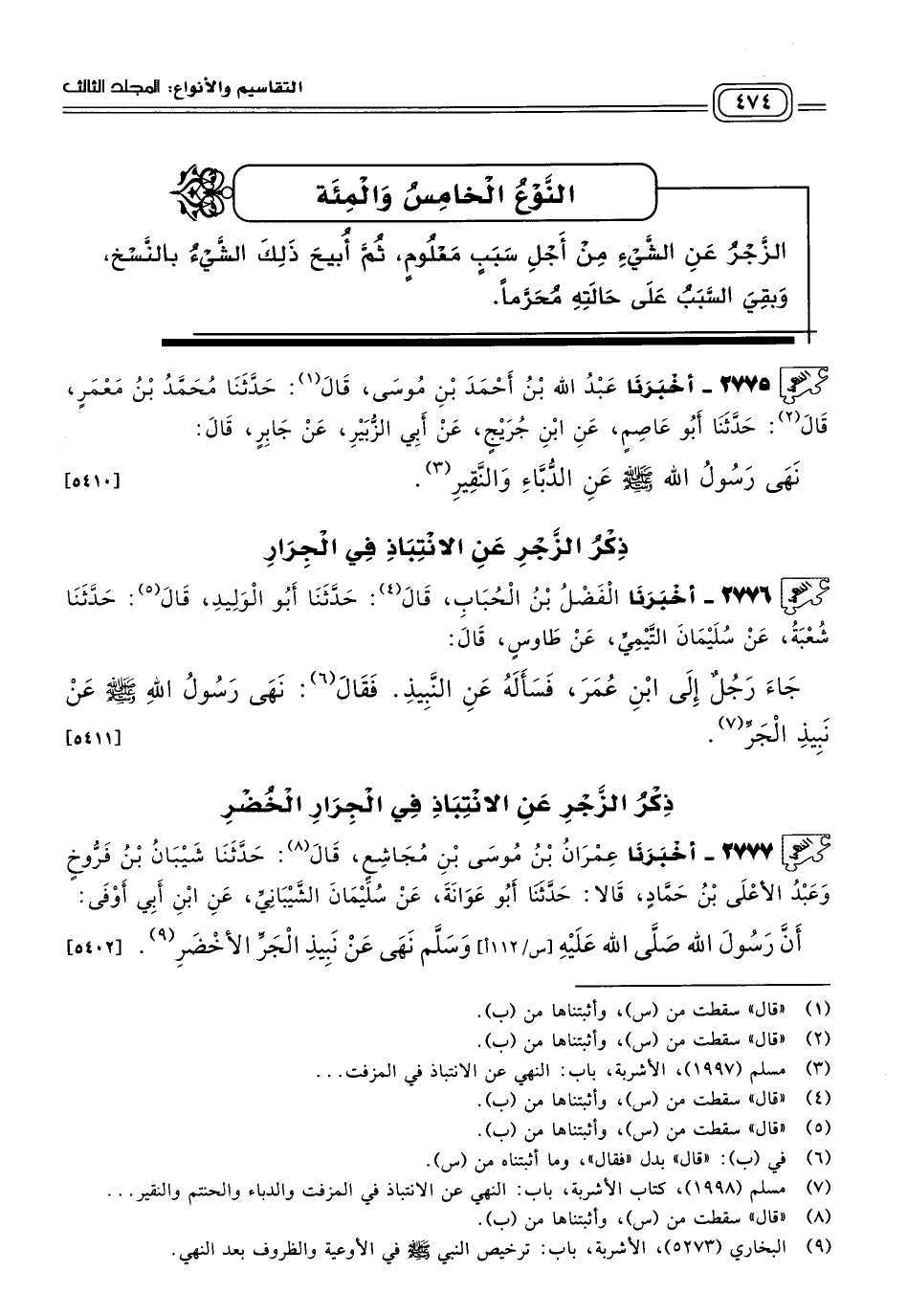 ٢٧٧٧ - أَخبَرنا عِمْرَانُ بْنُ مُوسَى بْنِ مُجَاشِعٍ، قَالَ: حَدثنا شَيْبَانُ بْنُ فَرُّوخَ، وَعَبْدُ الأَعْلَى بْنُ حَمَّادٍ، قَالَا: حَدثنا أَبُو عَوَانَةَ، عَنْ سُلَيْمَانَ الشَّيْبَانِيِّ، عَنِ ابْنِ أَبِي أَوْفَى، أَنَّ رَسُولَ اللهِ صَلى الله عَلَيه وسَلم نَهَى عَنْ نَبِيذِ الْجَرِّ الأَخْضَرِ. [٥٤٠٢]