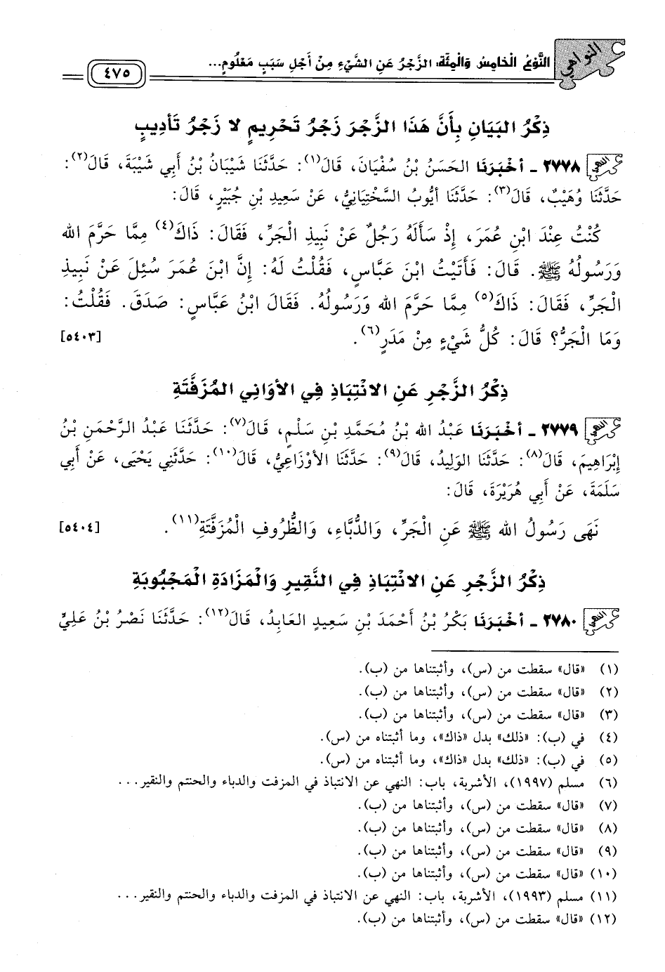 ٢٧٨٠ - أَخبَرنا بَكْرُ بْنُ أَحْمَدَ بْنِ سَعِيدٍ الْعَابِدُ، قَالَ: حَدثنا نَصْرُ بْنُ عَلِيٍّ الْجَهْضَمِيُّ، قَالَ: حَدثنا نُوحُ بْنُ قَيْسٍ، قَالَ: حَدثنا ابْنُ عَوْنٍ، عَنِ ابْنِ سِيرِينَ، عَنْ أَبِي هُرَيْرَةَ، عَنِ النَّبِيِّ صَلى الله عَلَيه وسَلم، أَنَّهُ قَالَ لِوَفْدِ عَبْدِ الْقَيْسِ: "أَنْهَاكُمْ عَنِ النَّقِيرِ وَالْمُقَيَّرِ وَالْحَنْتَمِ وَالدُّبَّاءِ، وَالْمَزَادَةِ الْمَجْبُوبَةِ، وَاشْرَبْ فِي سِقَائِكَ وَأَوْكِهِ". [٥٤٠٥]