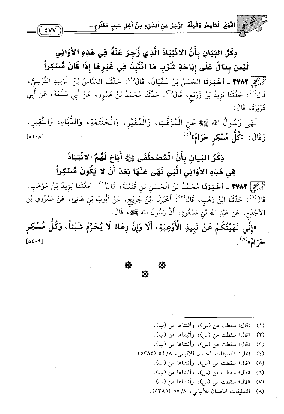 ٢٧٨٣ - أَخبَرنا مُحَمَّدُ بْنُ الْحَسَنِ بْنِ قُتَيْبَةَ، قَالَ: حَدثنا يَزِيدُ بْنُ مَوْهَبٍ، قَالَ: حَدثنا ابْنُ وَهْبٍ، قَالَ: أَخبَرنا ابْنُ جُرَيْجٍ، عَنْ أَيُّوبَ بْنِ هَانِئٍ، عَنْ مَسْرُوقِ بْنِ الأَجْدَعِ، عَنْ عَبْدِ اللهِ بْنِ مَسْعُودٍ، أَنَّ رَسُولَ اللهِ صَلى الله عَلَيه وسَلم قَالَ: "إِنِّي نَهَيْتُكُمْ عَنْ نَبِيذِ الأَوْعِيَةِ، أَلَا وَإِنَّ وِعَاءً لَا يُحَرِّمُ شَيْئًا، وَكُلُّ مُسْكِرٍ حَرَامٌ". [٥٤٠٩]