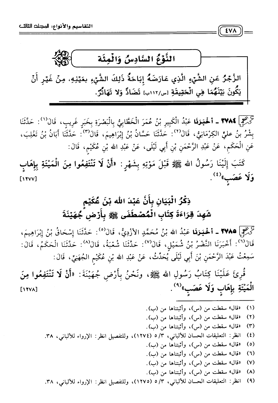 ٢٧٨٥ - أَخبَرنا عَبْدُ اللهِ بْنُ مُحَمَّدٍ الأَزْدِيُّ، قَالَ: حَدثنا إِسْحَاقُ بْنُ إِبْرَاهِيمَ، قَالَ: أَخبَرنا النَّضْرُ بْنُ شُمَيْلٍ، قَالَ: حَدثنا شُعْبَةُ، قَالَ: حَدثنا الْحَكَمُ، قَالَ: سَمِعْتُ عَبْدَ الرَّحْمَنِ بْنَ أَبِي لَيْلَى، يُحَدِّثُ عَنْ عَبْدِ اللهِ بْنِ عُكَيْمٍ الْجُهَنِيِّ، قَالَ: قُرِئَ عَلَيْنَا كِتَابُ رَسُولِ اللهِ صَلى الله عَلَيه وسَلم وَنَحْنُ بِأَرْضِ جُهَيْنَةَ: "أَنْ لَا تَنْتَفِعُوا مِنَ الْمَيْتَةِ بِإِهَابٍ وَلَا عَصَبٍ". [١٢٧٨]
