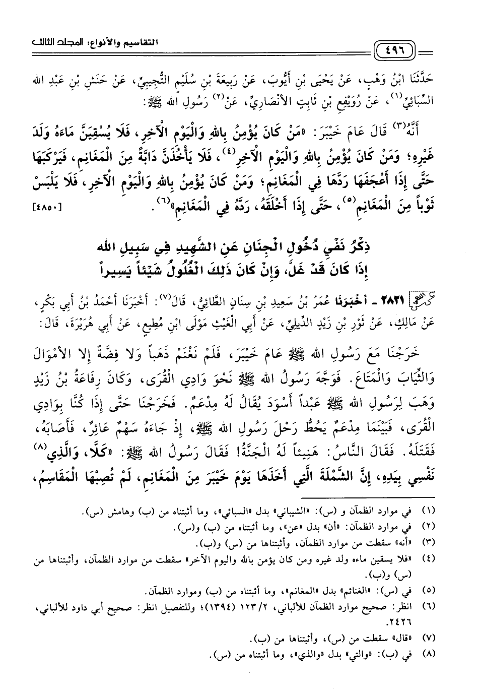 ٢٨٢١ - أَخبَرنا عُمَرُ بْنُ سَعِيدِ بْنِ سِنَانٍ الطَّائِيُّ، قَالَ: أَخبَرنا أَحْمَدُ بْنُ أَبِي بَكْرٍ، عَنْ مَالِكٍ، عَنْ ثَوْرِ بْنِ زَيْدٍ الدِّيلِيِّ، عَنْ أَبِي الْغَيْثِ، مَوْلَى ابْنِ مُطِيعٍ، عَنْ أَبِي هُرَيْرَةَ، قَالَ: خَرَجْنَا مَعَ رَسُولِ اللهِ صَلى الله عَلَيه وسَلم عَامَ خَيْبَرَ، فَلَمْ نَغْنَمْ ذَهَبًا وَلَا فِضَّةً إِلَاّ الأَمْوَالَ وَالثِّيَابَ، وَالْمَتَاعَ، فَوَجَّهَ رَسُولُ اللهِ صَلى الله عَلَيه وسَلم نَحْوَ وَادِي الْقُرَى، وَكَانَ رِفَاعَةُ بْنُ زَيْدٍ وَهَبَ لِرَسُولِ اللهِ صَلى الله عَلَيه وسَلم عَبْدًا أَسْوَدَ، يُقَالُ لَهُ مِدْعَمٌ، فَخَرَجْنَا حَتَّى إِذَا كُنَّا بِوَادِي الْقُرَى، فَبَيْنَمَا مِدْعَمٌ يَحُطُّ رَحْلَ رَسُولِ اللهِ صَلى الله عَلَيه وسَلم، إِذْ جَاءَهُ سَهْمٌ عَائِرٌ، فَأَصَابَهُ فَقَتَلَهُ.