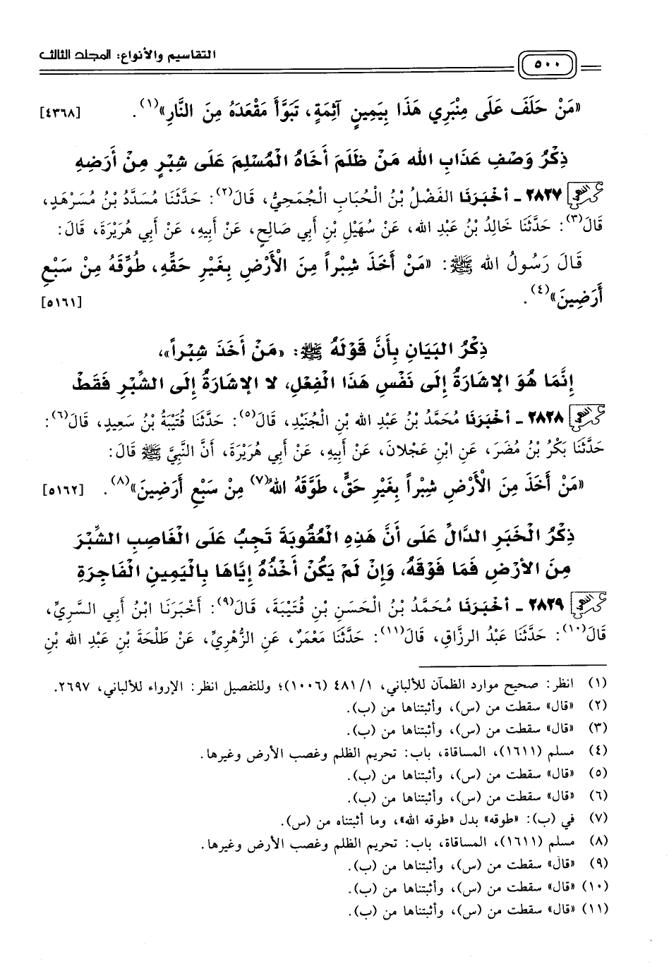 ٢٨٢٧ - أَخبَرنا الْفَضْلُ بْنُ الْحُبَابِ الْجُمَحِيُّ، قَالَ: حَدثنا مُسَدَّدُ بْنُ مُسَرْهَدٍ، قَالَ: حَدثنا خَالِدُ بْنُ عَبْدِ اللهِ، عَنْ سُهَيْلِ بْنِ أَبِي صَالِحٍ، عَنْ أَبِيهِ، عَنْ أَبِي هُرَيْرَةَ، قَالَ: قَالَ رَسُولُ اللهِ صَلى الله عَلَيه وسَلم: "مَنْ أَخَذَ شِبْرًا مِنَ الأَرْضِ بِغَيْرِ حَقِّهِ طُوِّقَهُ مِنْ سَبْعِ أَرَضِينَ". [٥١٦١]