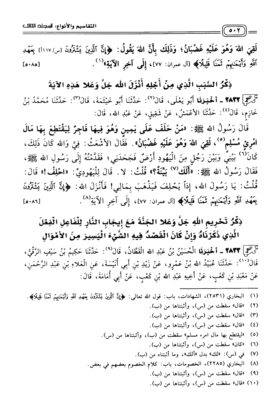 ٢٨٣٢ - أَخبَرنا أَبُو يَعْلَى، قَالَ: حَدثنا أَبُو خَيْثَمَةَ، قَالَ: حَدثنا مُحَمَّدُ بْنُ خَازِمٍ، قَالَ: حَدثنا الأَعْمَشُ، عَنْ شَقِيقٍ، عَنْ عَبْدِ اللهِ، قَالَ: قَالَ رَسُولُ اللهِ صَلى الله عَلَيه وسَلم: "مَنْ حَلَفَ عَلَى يَمِينٍ وَهُوَ فِيهَا فَاجِرٌ ليقتطع بها مال امرئٍ مسلم، لَقِيَ اللهَ وَهُوَ عَلَيْهِ غَضْبَانُ"، فَقَالَ الأَشْعَثُ: فِيَّ وَاللهِ كَانَ ذَلِكَ، كَانَ بَيْنِي وَبَيْنَ رَجُلٍ مِنَ الْيَهُودِ أَرْضٌ فَجَحَدَنِي، فَقَدَّمْتُهُ إِلَى رَسُولِ اللهِ صَلى الله عَلَيه وسَلم، فَقَالَ رَسُولُ اللهِ صَلى الله عَلَيه وسَلم: "أَلَكَ بَيِّنَةٌ؟ " قُلْتُ: لَا، قَالَ لِلْيَهُودِيِّ: "احْلِفْ"، قَالَ: قُلْتُ: يَا رَسُولَ اللهِ، إِذًا يَحْلِفُ، فَيَذْهَبُ بِمَالِي، فَأَنْزَلَ اللهُ، {إِنَّ الَّذِينَ يَشْتَرُونَ بِعَهْدِ اللهِ وَأَيْمَانِهِمْ ثَمَنًا قَلِيلاً} [آل عمران: ٧٧] إِلَى آخِرِ الآيَةِ. [٥٠٨٦]