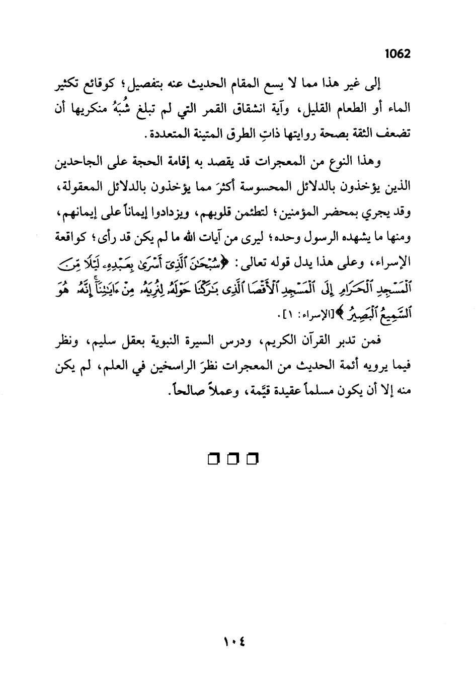 فمن تدبر القرآن الكريم، ودرس السيرة النبوية بعقل سليم، ونظر فيما يرويه أئمة الحديث من المعجرات نظرَ الراسخين في العلم، لم يكن منه إلا أن يكون مسلماً عقيدة قيَّمة، وعملاً صالحاً.