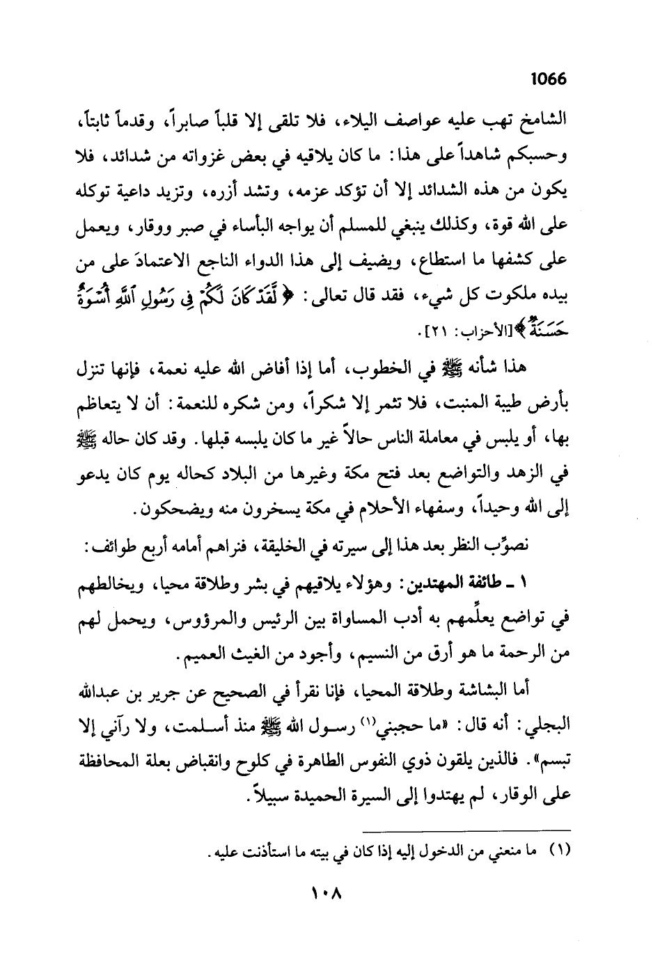 أما البشاشة وطلاقة المحيا، فإنا نقرأ في الصحيح عن جرير بن عبد الله البجلي: أنه قال: "ما حجبني (¬1) رسول الله - صلى الله عليه وسلم - منذ أسلمت، ولا رآني إلا تبسم". فالذين يلقون ذوي النفوس الطاهرة في كلوح وانقباض بعلة المحافظة على الوقار، لم يهتدوا إلى السيرة الحميدة سبيلاً.