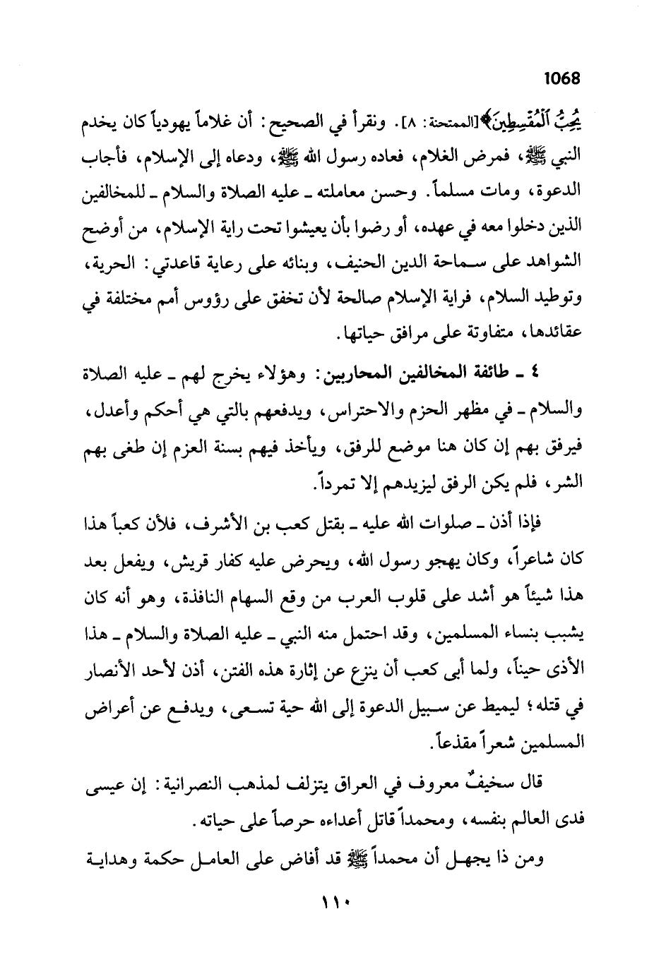 4 - طائفة المخالفين المحاربين: وهؤلاء يخرج لهم - عليه الصلاة والسلام - في مظهر الحزم والاحتراس، ويدفعهم بالتي هي أحكم وأعدل، فيرفق بهم إن كان هنا موضع للرفق، ويأخذ فيهم بسنة العزم إن طغى بهم الشر، فلم يكن الرفق ليزيدهم إلا تمرداً.