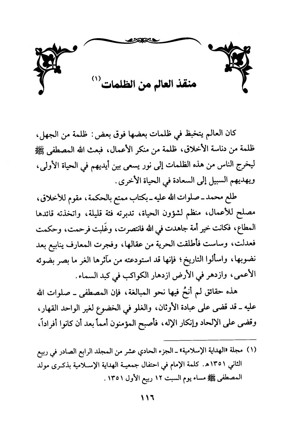 (¬1) مجلة "الهداية الإسلامية" - الجزء الحادي عشر من المجلد الرابع الصادر في ربيع الثاني 1351 هـ. كلمة الأمام في احتفال جمعية الهداية الأسلامية بذكرى مولد المصطفى - صلى الله عليه وسلم - مساء يوم السبت 12 ربيع الأول 1351.
