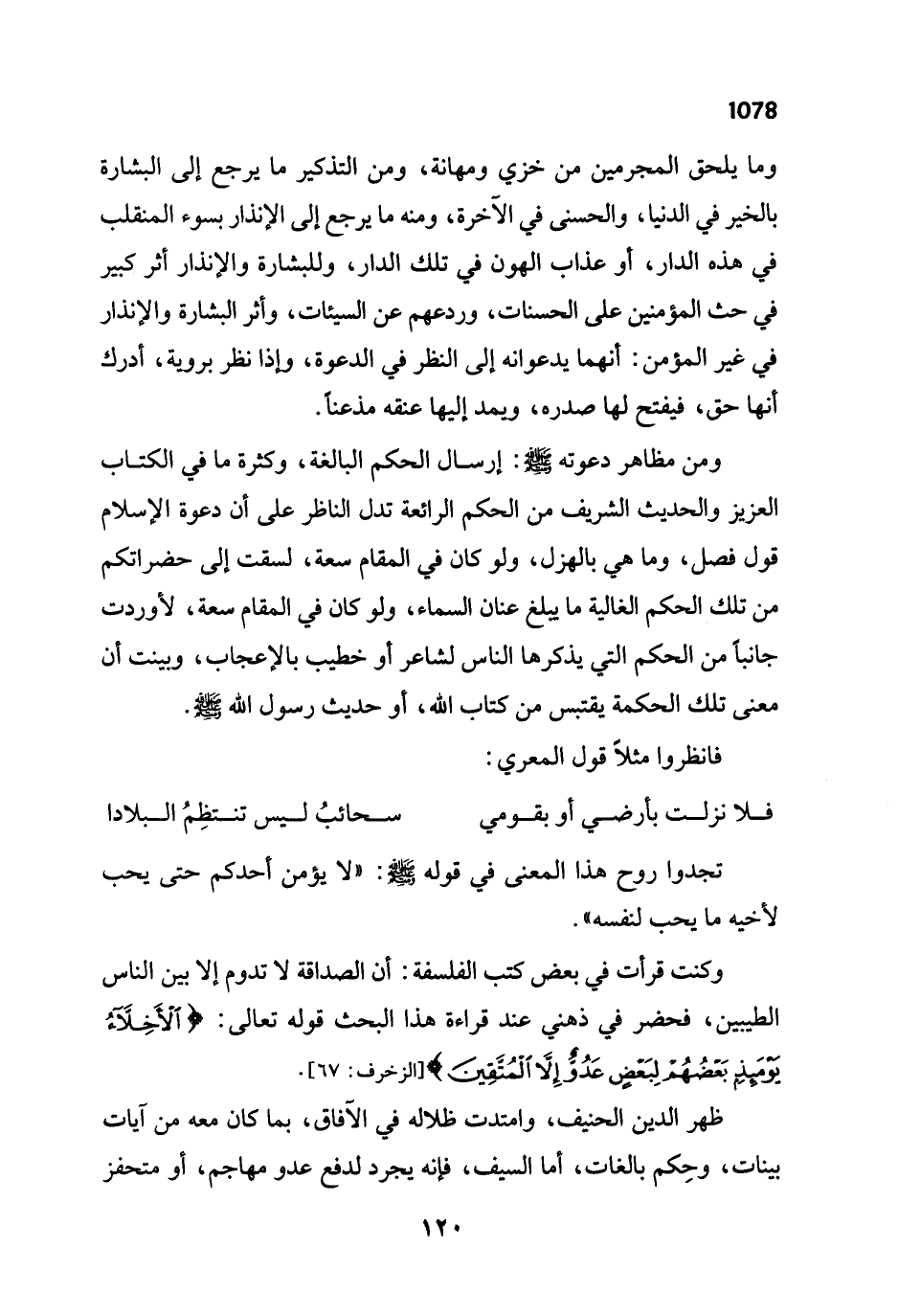 ومن مظاهر دعوته - صلى الله عليه وسلم -: إرسال الحكم البالغة، وكثرة ما في الكتاب العزيز والحديث الشريف من الحكم الرائعة تدل الناظر على أن دعوة الإسلام قول فصل، وما هي بالهزل، ولو كان في المقام سعة، لسقت إلى حضراتكم من تلك الحكم الغالية ما يبلغ عنان السماء، ولو كان في المقام سعة، لأوردت جانباً من الحكم التي يذكرها الناس لشاعر أو خطيب بالإعجاب، وبينت أن معنى تلك الحكمة يقتبس من كتاب الله، أو حديث رسول الله - صلى الله عليه وسلم -.