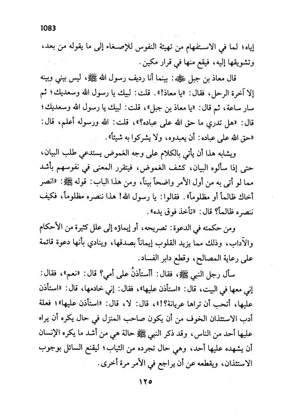 قال معاذ بن جبل - رضي الله عنه -: بينما أنا رديف رسول الله - صلى الله عليه وسلم -، ليس بيني وبينه إلا آخرة الرحل، فقال: "يا معاذ! ". قلت: لبيك يا رسول الله وسعديك؛ ثم سار ساعة، ثم قال: "يا معاذ بن جبل"، قلت: لبيك يا رسول الله وسعديك؛ قال: "هل تدري ما حق الله على عباده؟ "، قلت: الله ورسوله أعلم، قال: "حق الله على عباده: أن يعبدوه، ولا يشركوا به شيئاً".