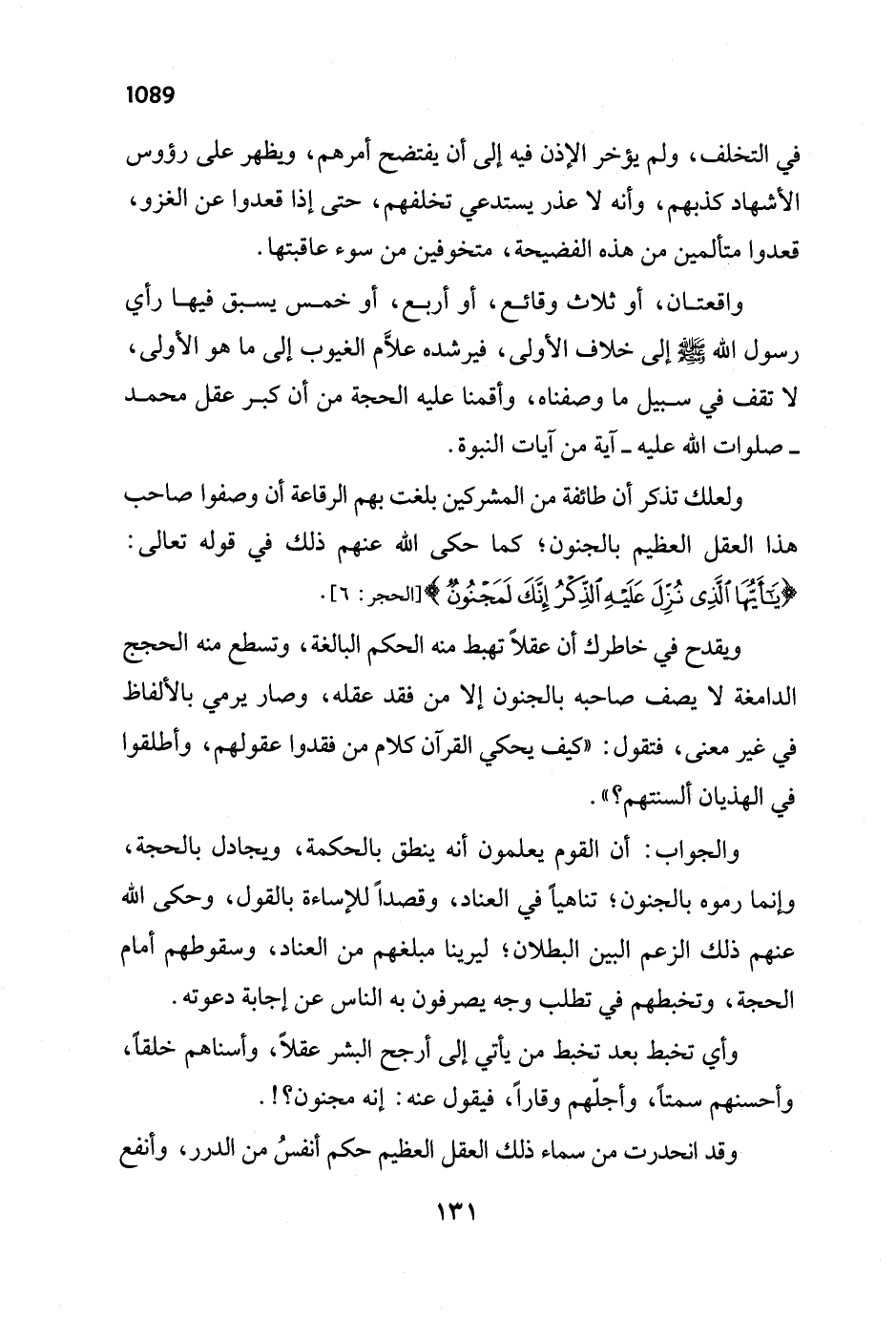 ويقدح في خاطرك أن عقلاً تهبط منه الحكم البالغة، وتسطع منه الحجج الدامغة لا يصف صاحبه بالجنون إلا من فقد عقله، وصار يرمي بالألفاظ في غير معنى، فتقول: "كيف يحكي القرآن كلام من فقدوا عقولهم، وأطلقوا في الهذيان ألسنتهم؟ ".