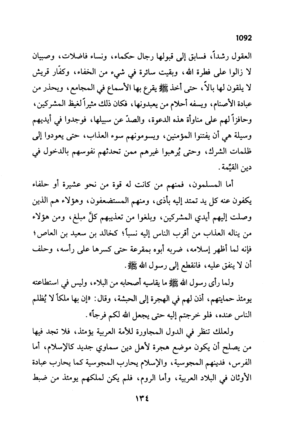 ولعلك تنظر في الدول المجاورة للأمة العربية يؤمئذ، فلا تجد فيها من يصلح أن يكون موضع هجرة لأهل دين سماوي جديد كالإسلام، أما الفرس، فدينهم المجوسية، والإسلام يحارب المجوسية كما يحارب عبادة الأوثان في البلاد العربية، وأما الروم، فلم يكن لملكهم يومئذ من ضبط