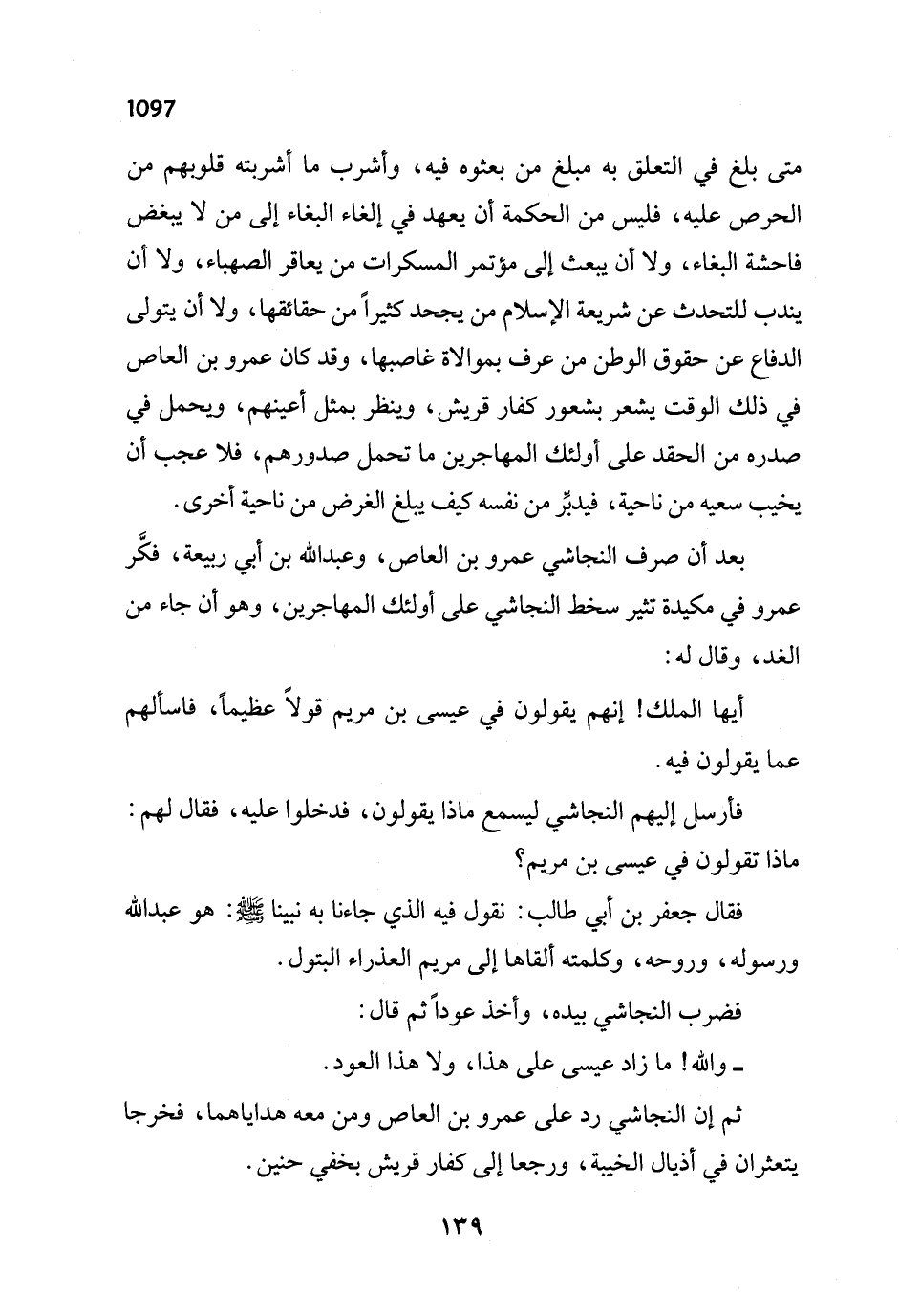 متى بلغ في التعلق به مبلغ من بعثوه فيه، وأشرب ما أشربته قلوبهم من الحرص عليه، فليس من الحكمة أن يعهد في إلغاء البغاء إلى من لا يبغض فاحشة البغاء، ولا أن يبعث إلى مؤتمر المسكرات من يعاقر الصهباء، ولا أن يندب للتحدث عن شريعة الإسلام من يجحد كثيراً من حقائقها، ولا أن يتولى الدفاع عن حقوق الوطن من عرف بموالاة غاصبها، وقد كان عمرو بن العاص في ذلك الوقت يشعر بشعور كفار قريش، وينظر بمثل أعينهم، ويحمل في صدره من الحقد على أولئك المهاجرين ما تحمل صدورهم، فلا عجب أن يخيب سعيه من ناحية، فيدبِّر من نفسه كيف يبلغ الغرض من ناحية أخرى.