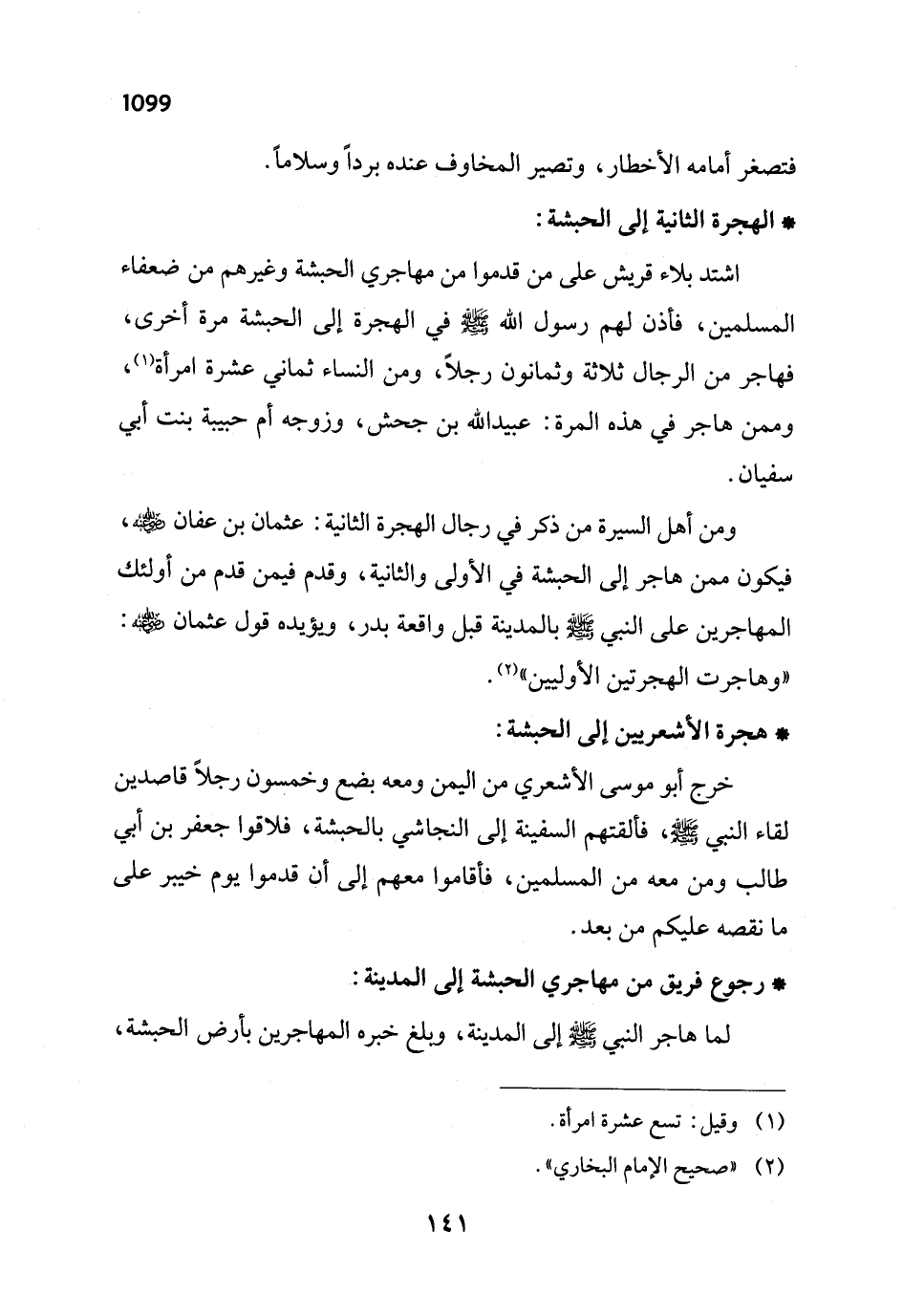 ومن أهل السيرة من ذكر في رجال الهجرة الثانية: عثمان بن عفان - صلى الله عليه وسلم -، فيكون ممن هاجر إلى الحبشة في الأولى والثانية، وقدم فيمن قدم من أولئك المهاجرين على النبي - صلى الله عليه وسلم - بالمدينة قبل واقعة بدر، ويؤيده قول عثمان - رضي الله عنه -: "وهاجرت الهجرتين الأوليين" (¬2).