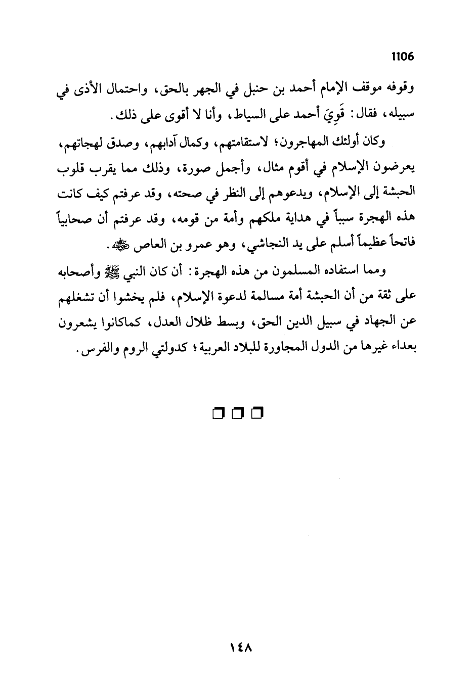 وكان أولئك المهاجرون؛ لاستقامتهم، وكمال آدابهم، وصدق لهجاتهم، يعرضون الإسلام في أقوم مثال، وأجمل صورة، وذلك مما يقرب قلوب الحبشة إلى الإسلام، ويدعوهم إلى النظر في صحته، وقد عرفتم كيف كانت هذه الهجرة سبباً في هداية ملكهم وأمة من قومه، وقد عرفتم أن صحابيًا فاتحًا عظيماً أسلم على يد النجاشي، وهو عمرو بن العاص - رضي الله عنه -.