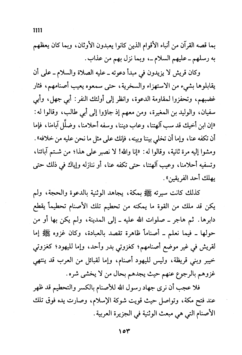 كذلك كانت سيرته - صلى الله عليه وسلم - بمكة، يجاهد الوثنية بالدعوة والحجة، ولم يكن قد ملك من القوة ما يمكنه من تحطيم تلك الأصنام تحطيماً يقطع دابرها. ثم هاجر -صلوات الله عليه- إلى المدينة، ولم يكن بها أو من حولها -فيما نعلم- أصناماً ظاهرة تقصد بالعبادة، وكان غزوه - صلى الله عليه وسلم - إما لقريش في غير موضع أصنامهم؛ كغزوتي بدر وأحد، وإما لليهود؛ كغزوتي خيبر وبني قريظة، وليس لليهود أصنام، وإما لقبائل من العرب قد ينتهي غزوهم بالرجوع عنهم حيث يجدهم بحال من لا يخشى شره.