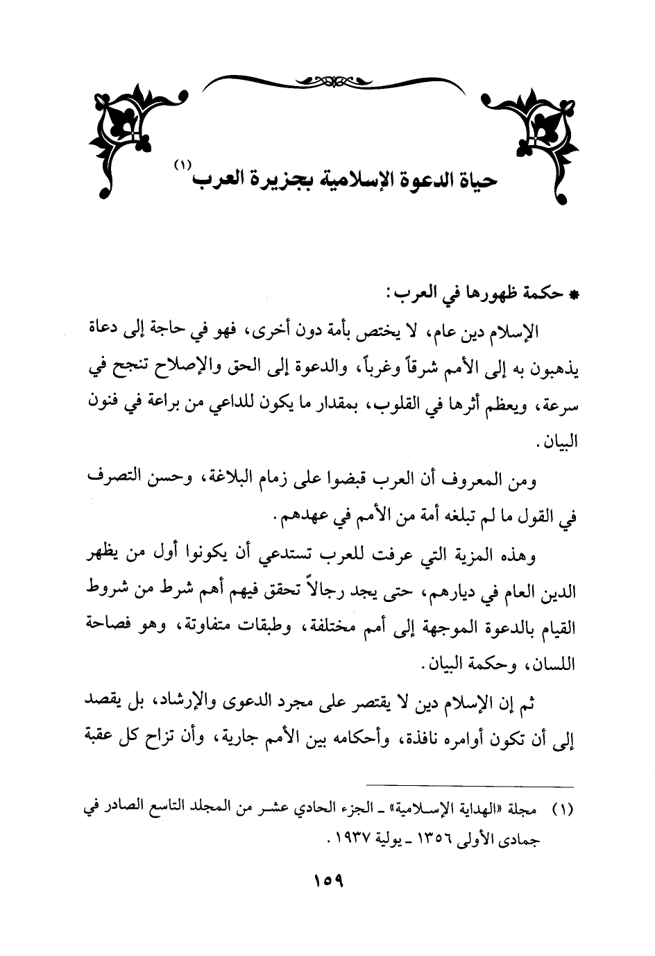 وهذه المزية التي عرفت للعرب تستدعي أن يكونوا أول من يظهر الدين العام في ديارهم، حتى يجد رجالاً تحقق قيهم أهم شرط متن شروط القيام بالدعوة الموجهة إلى أمم مختلفة، وطبقات متفاوتة، وهو فصاحة اللسان، وحكمة البيان.