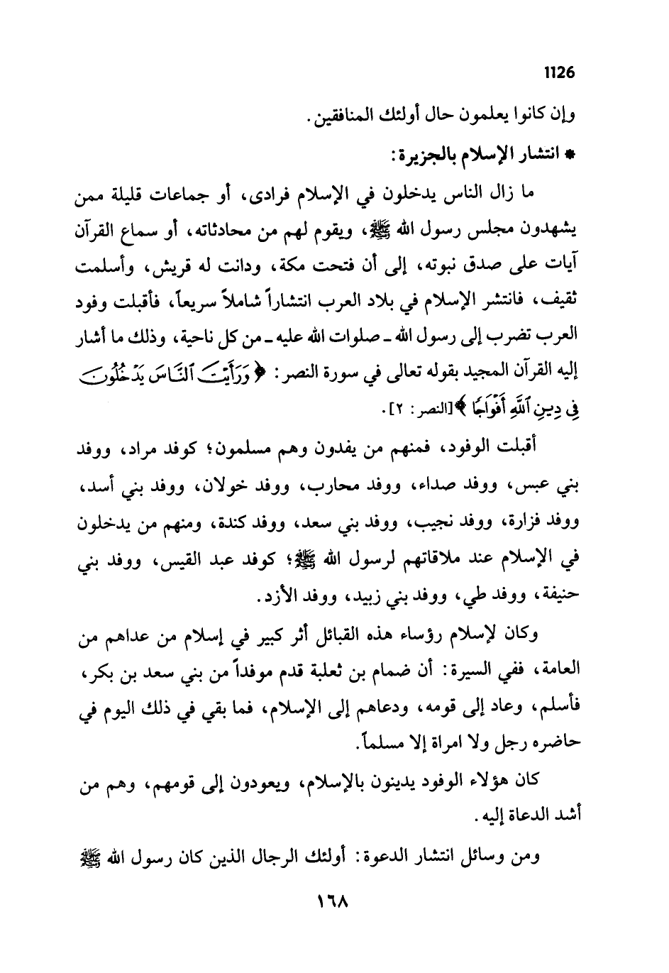 ما زال الناس يدخلون في الإسلام فرادى، أو جماعات قليلة ممن يشهدون مجلس رسول الله - صلى الله عليه وسلم -، ويقوم لهم من محادثاته، أو سماع القرآن آيات على صدق نبوته، إلى أن فتحت مكة، ودانت له قريش، وأسلمت ثقيف، فانتشر الإسلام في بلاد العرب انتشارًا شاملًا سريعاً، فأقبلت وفود العرب تضرب إلى رسول الله - صلوات الله عليه - من كل ناحية، وذلك ما أشار إليه القرآن المجيد بقوله تعالى في سورة النصر: {وَرَأَيْتَ النَّاسَ يَدْخُلُونَ فِي دِينِ اللَّهِ أَفْوَاجًا} [النصر: 2].
