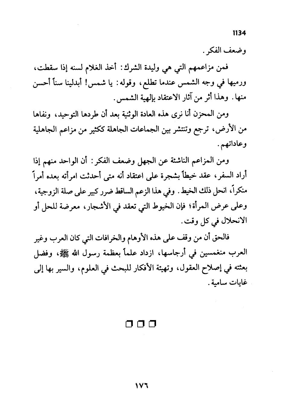 فالحق أن من وقف على هذه الأوهام والخرافات التي كان العرب وغير العرب منغمسين في أرجاسها، ازداد علماً بعظمة رسول الله - صلى الله عليه وسلم -، وفضل بعثته في إصلاح العقول، وتهيئة الأفكار للبحث في العلوم، والسير بها إلى غايات سامية.