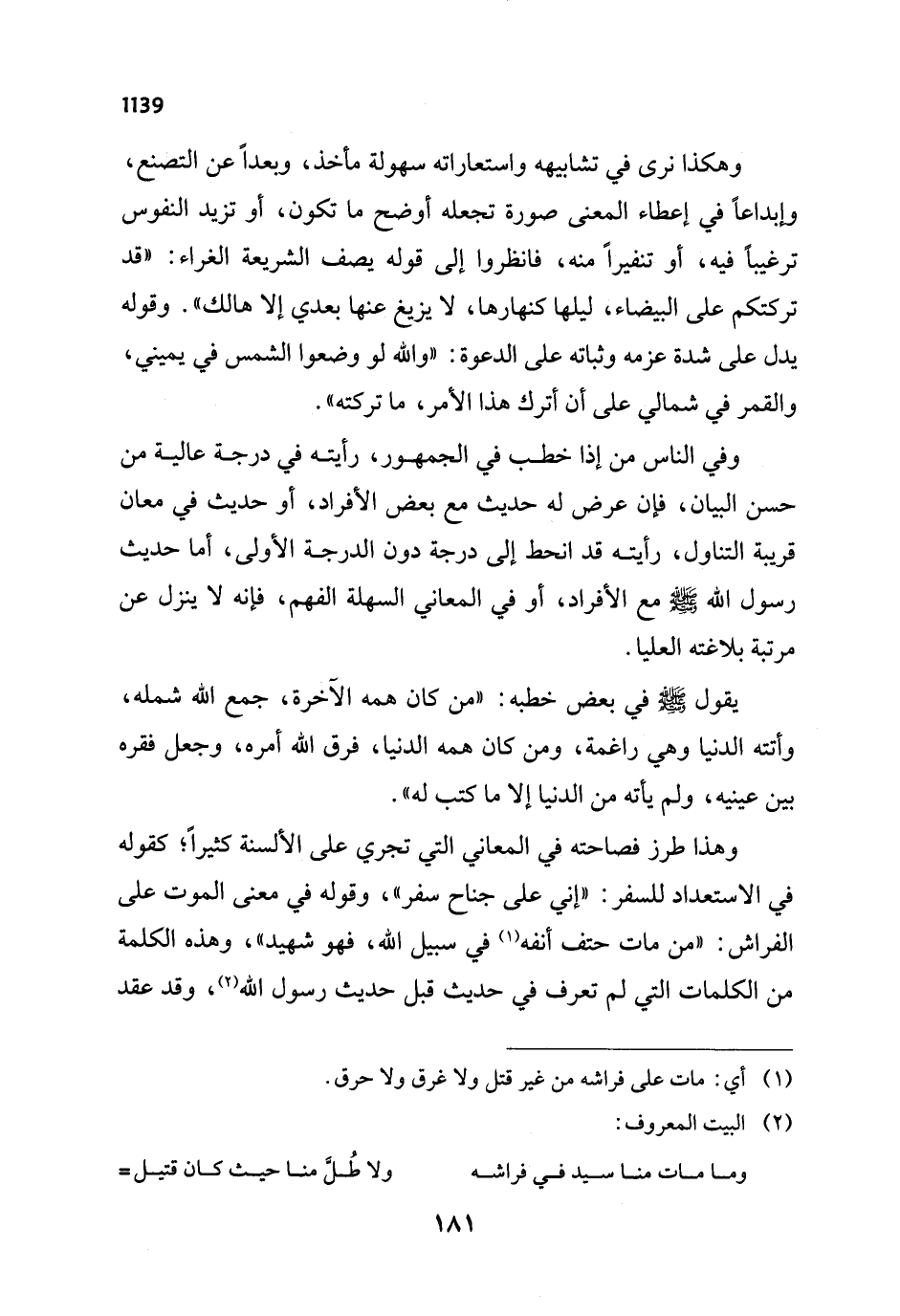 وهذا طرز فصاحته في المعاني التي تجري على الألسنة كثيراً؛ كقوله في الاستعداد للسفر: "إني على جناح سفر"، وقوله في معنى الموت على الفراش: "من مات حتف أنفه (¬1) في سبيل الله، فهو شهيد"، وهذه الكلمة من الكلمات التي لم تعرف في حديث قبل حديث رسول الله (¬2)، وقد عقد