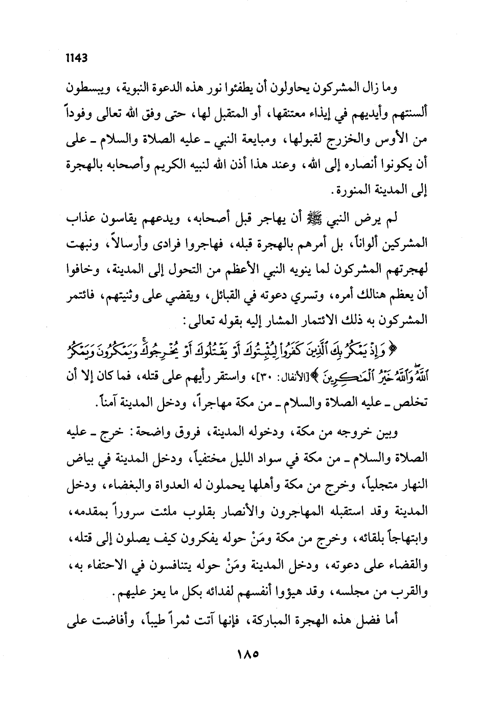 {وَإِذْ يَمْكُرُ بِكَ الَّذِينَ كَفَرُوا لِيُثْبِتُوكَ أَوْ يَقْتُلُوكَ أَوْ يُخْرِجُوكَ وَيَمْكُرُونَ وَيَمْكُرُ اللَّهُ وَاللَّهُ خَيْرُ الْمَاكِرِينَ} [الأنفال: 30]، واستقر رأيهم على قتله، فما كان إلا أن تخلص - عليه الصلاة والسلام - من مكة مهاجراً، ودخل المدينة آمناً.