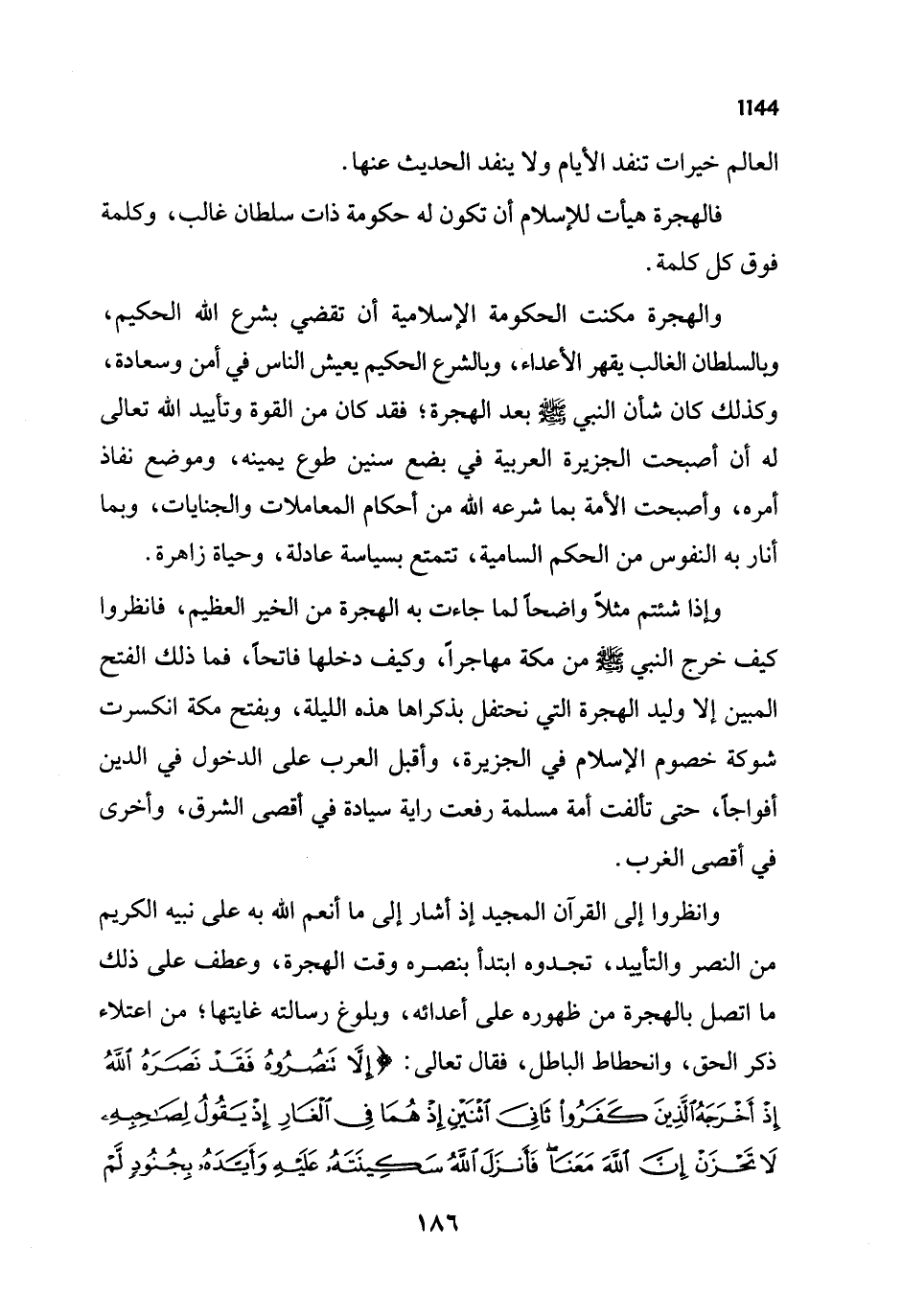 فالهجرة هيأت للإسلام أن تكون له حكومة ذات سلطان غالب، وكلمة فوق كل كلمة.