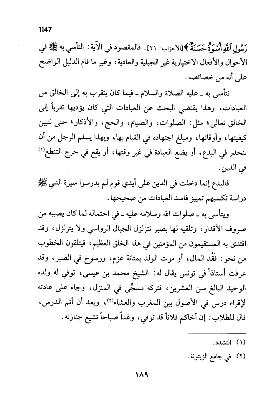 ويتأسى به - صلوات الله وسلامه عليه - في احتماله لما كان يصيبه من صروف الأقدار، وتلقيه لها بصبر تتزلزل الجبال الرواسي ولا يتزلزل، وقد اقتدى به المستقيمون من المؤمنين في هذا الخلق العظيم، فيتلقون الخطوب من نحو: فَقْد المال، أو موت الولد بمتانة عزم، ورسوخ في الصبر، وقد عرفت أستاذاً في تونس يقال له: الشيخ محمد بن عيسى، توفي له ولده الوحيد البالغ سن العشرين، فتركه مسجًّى في المنزل، وجاء على عادته لإقراء درس في الأصول بين المغرب والعشاء (¬2)، وبعد أن أتم الدرس، قال للطلاب: إن أخاكم فلاناً قد توفي، وغداً صباحاً تشيع جنازته.