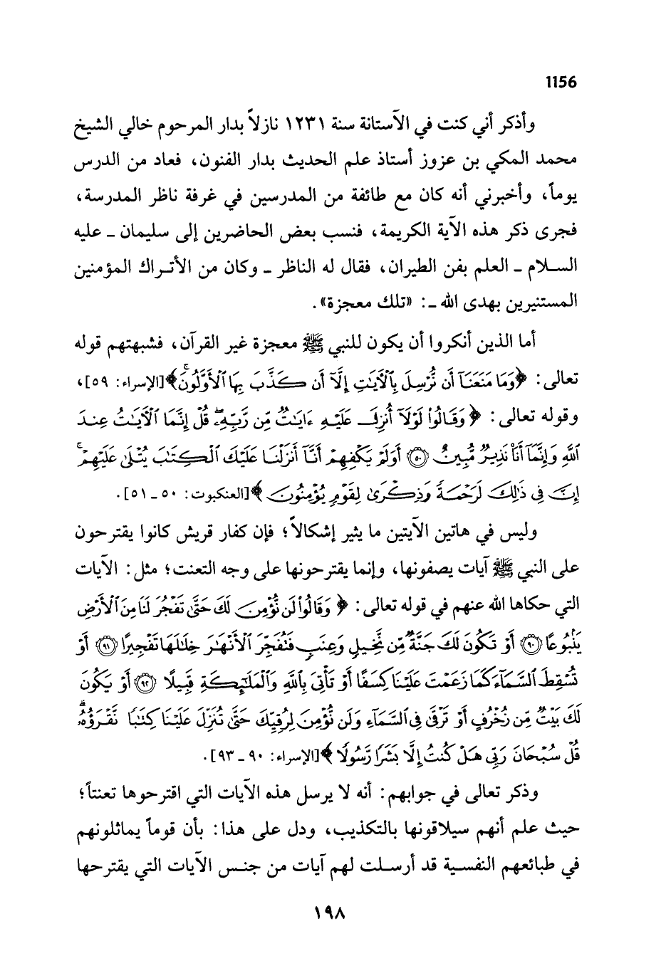 وأذكر أني كنت في الآستانة سنة 1231 نازلاً بدار المرحوم خالي الشيخ محمد المكي بن عزوز أستاذ علم الحديث بدار الفنون، فعاد من الدرس يوماً، وأخبرني أنه كان مع طائفة من المدرسين في غرفة ناظر المدرسة، فجرى ذكر هذه الآية الكريمة، فنسب بعض الحاضرين إلى سليمان - عليه السلام - العلم بفن الطيران، فقال له الناظر - وكان من الأتراك المؤمنين المستنيرين بهدى الله -: "تلك معجزة".