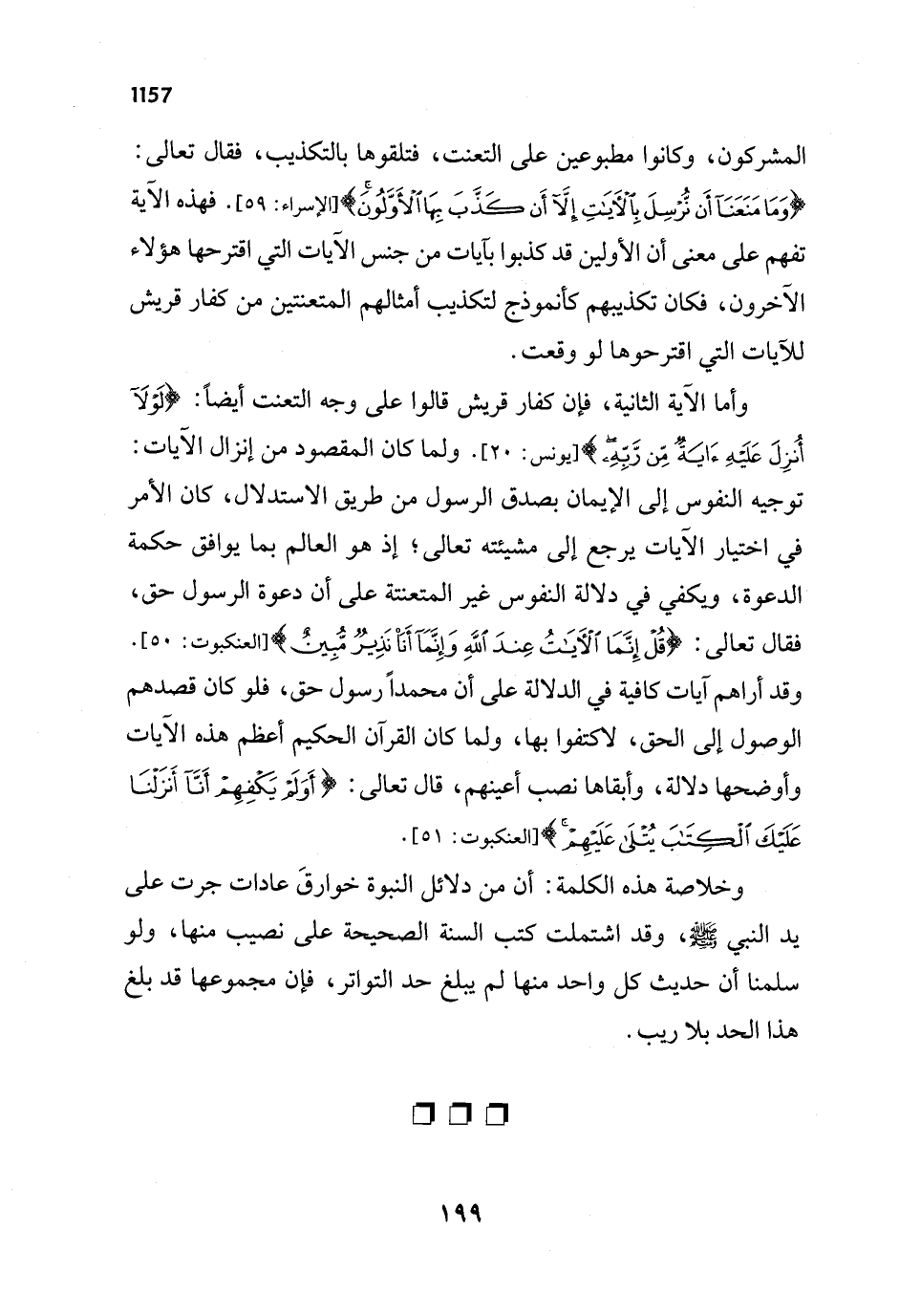 وخلاصة هذه الكلمة: أن من دلائل النبوة خوارقَ عادات جرت على يد النبي - صلى الله عليه وسلم -، وقد اشتملت كتب السنة الصحيحة على نصيب منها، ولو سلمنا أن حديث كل واحد منها لم يبلغ حد التواتر، فإن مجموعها قد بلغ هذا الحد بلا ريب.